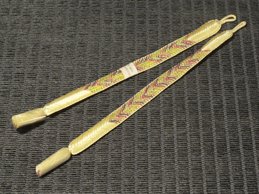 淡黄(たんこう)色の地に、若草色、中紅(なかべに)色、金色 、濃藍(こいあい)色で矢羽根の文様が組み込まれている、笹波組の羽織紐です。 未使用保管品で、しみやよごれ、褪色などのダメージもありません。新品同様です。 |