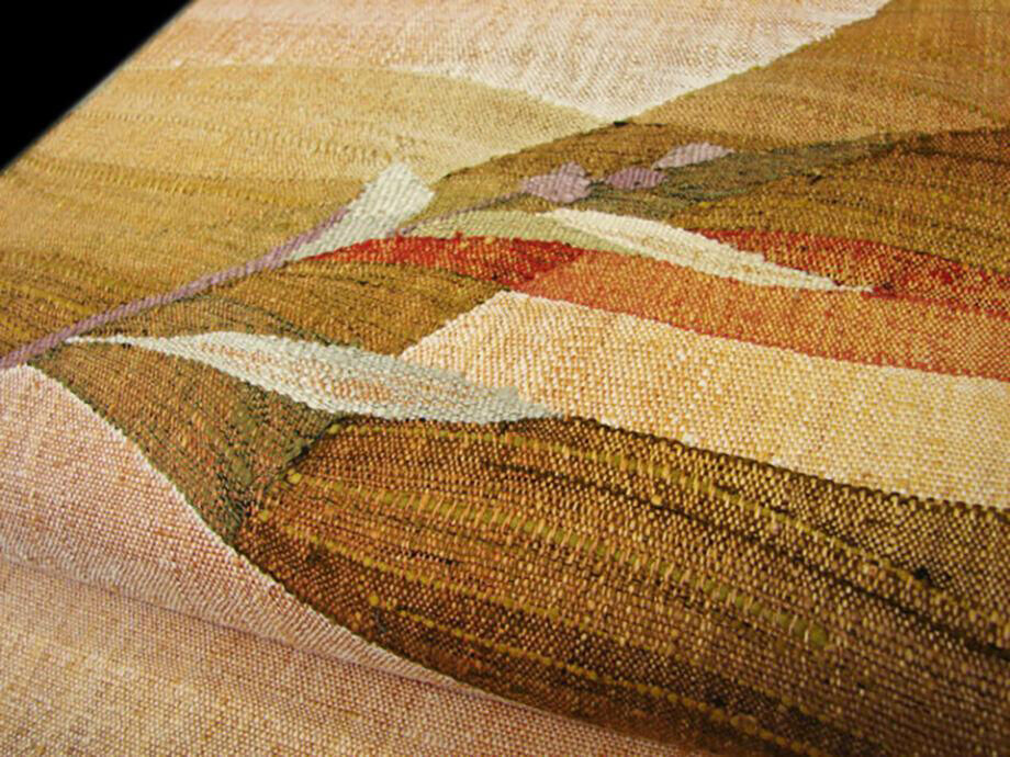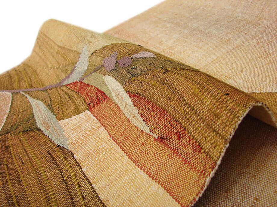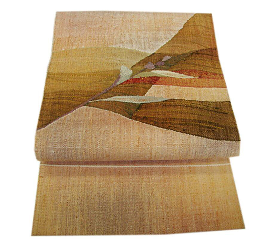 | 商品説明 | しなやかな扱い易く結び心地が愉しい紬地のなごや帯。 肌色地に茶、黄土、灰、藤、赤、老松色等の織柄。 たいこ柄。 |