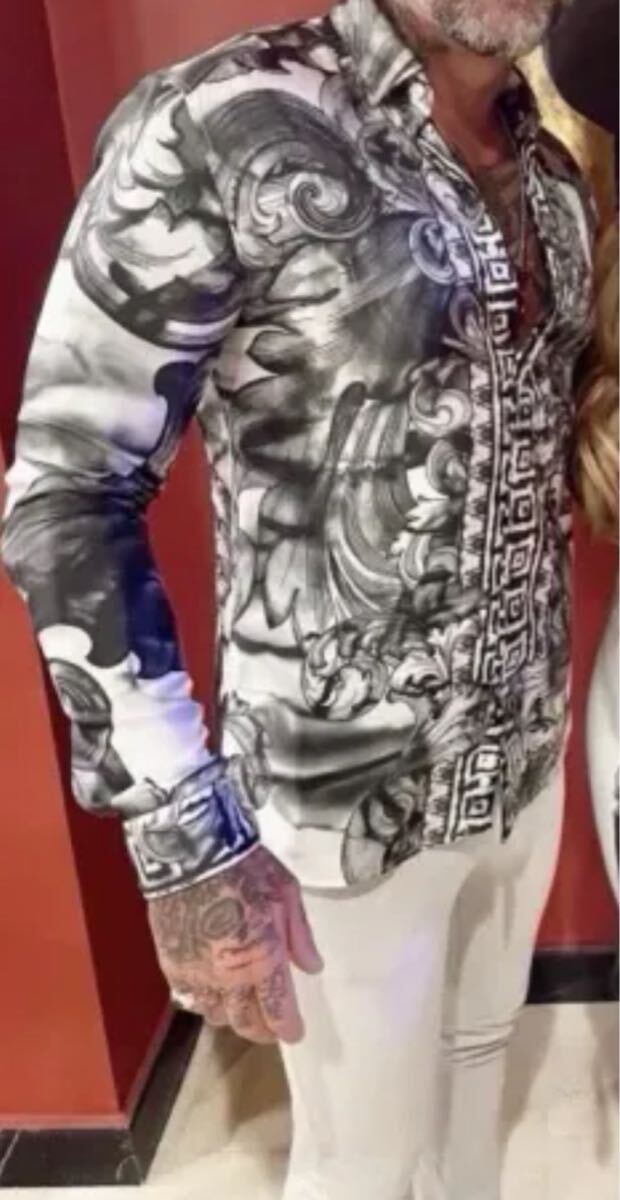 王者の風格!バロックシルク!versace シルクシャツ38白黒銀 総柄 收藏