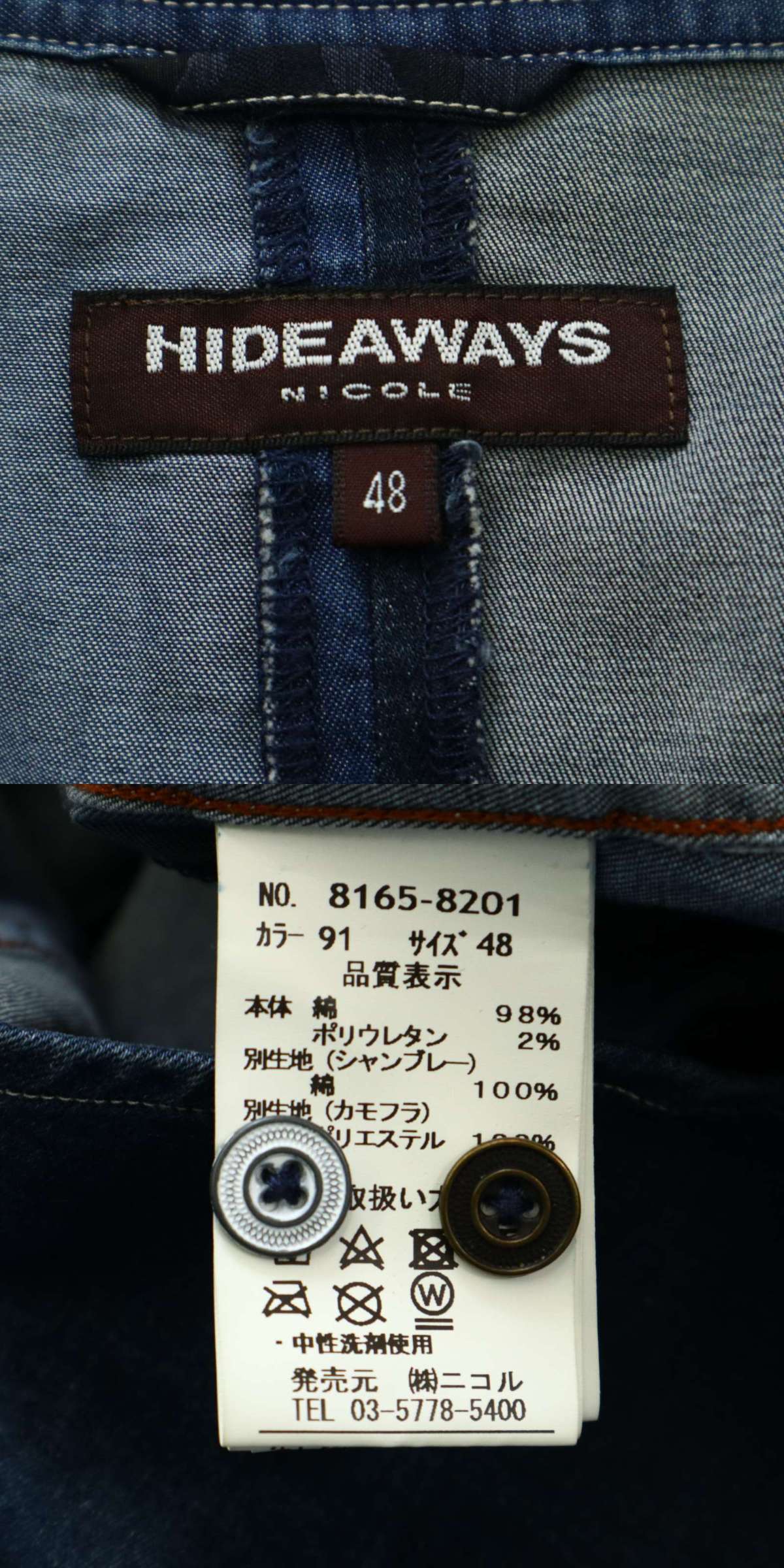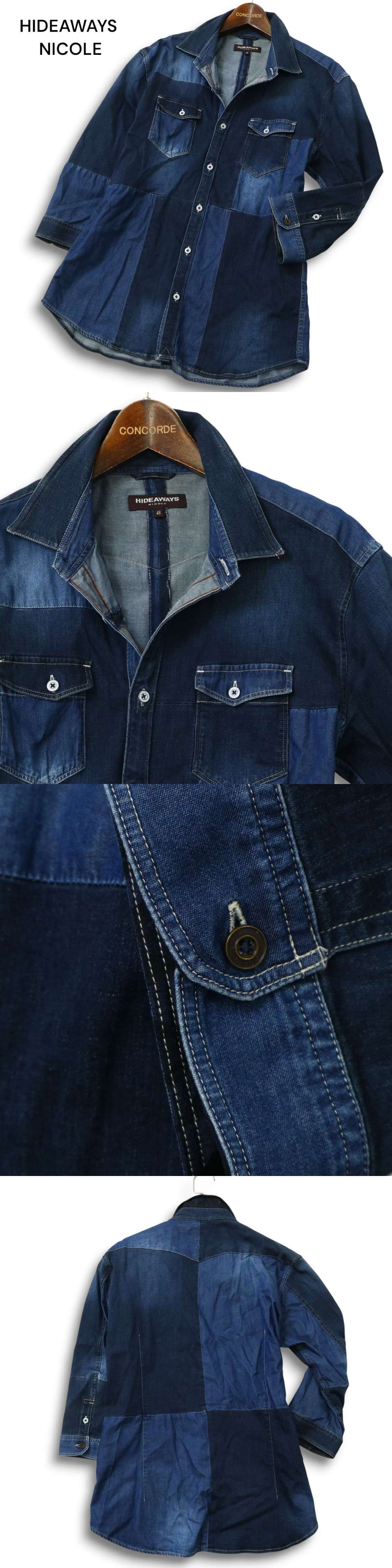 HIDEAWAYS NICOLE ハイダウェイ ニコル USED加工 パッチワーク★ 襟ワイヤー 7分袖 デニム シャツ Sz.48 メンズ C5T02589_3#A 收藏
