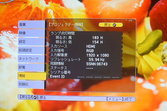 若色彩鮮やかに濃密な映像です。3000ルーメンの高輝度はさすがに明るく、部屋の蛍光灯下でも十分鑑賞できるほどで、スクリーン全体に力強さがあります。ランプ使用時間短いため鮮鋭感のある映像が映し出されています。細部表現力や階調表現力も秀逸で、低照度シーンの微妙な陰影表現から高輝度シーンのハイライト表現までEPSON 3LCDらしい濃密な色彩で描き分けているのがわかり、色純度の高さが印象的です。実写映像は添付写真をご覧ください(120インチホワイトマットスクリーンに当出品機で実際に投射した映像です)。