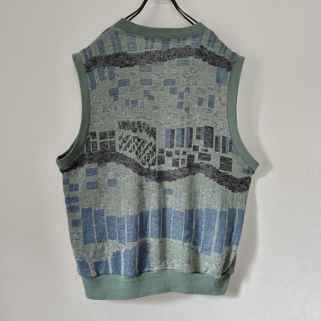 古着 総柄ベスト 前開き Vネック ニットベスト L レトロ 青 幾何学模様 個性的 重ね着 ニュアンスカラー ユニセックス 收藏