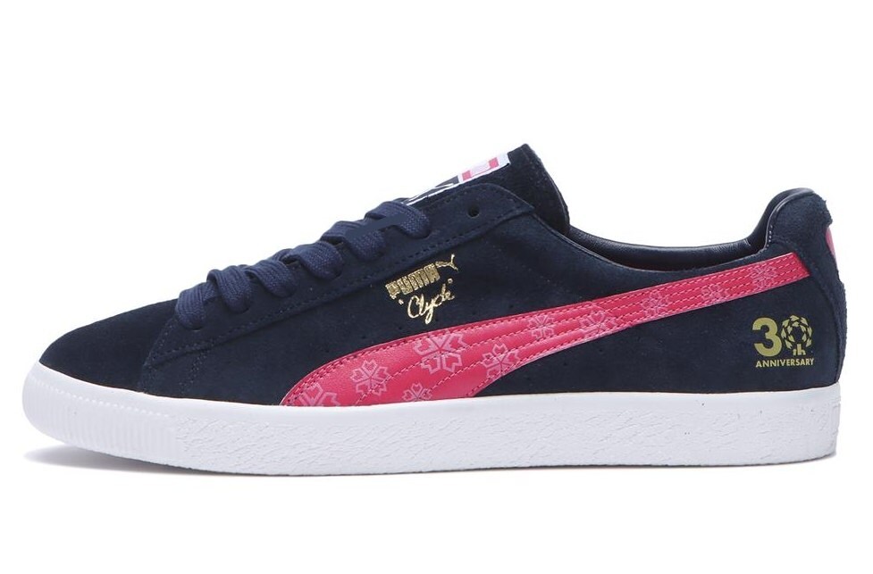 このコラボレーションモデルはPUMAのシグネチャースタイルであるCLYDEのMADE IN JAPANモデルで、チームカラーであるネイビーを基調に、セレッソピンクのフォームストリップに桜の花が散りばめられています。