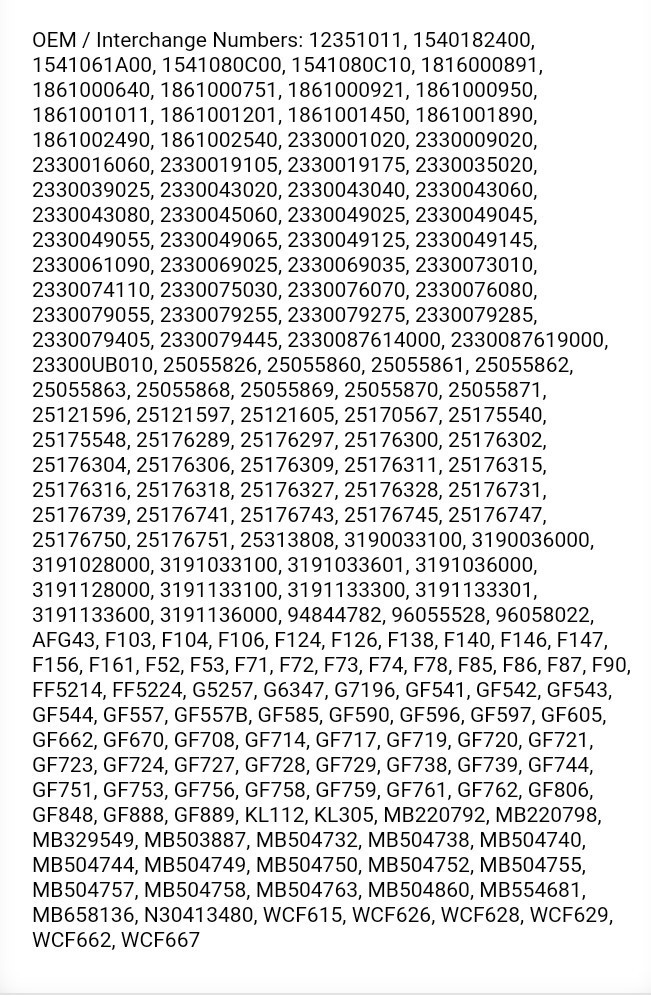 純正品番(互換品)12351011, 1540182400, 1541061A00, 1541080C00, 1541080C10, 1816000891, 1861000640, 1861000751, 1861000921, 1861000950, 1861001011, 1861001201, 1861001450, 1861001890, 1861002490, 1861002540, 2330001020, 2330009020, 2330016060, 2330019105, 2330019175, 2330035020, 2330039025, 2330043020, 2330043040, 2330043060, 2330043080, 2330045060, 2330049025, 2330049045, 2330049055, 2330049065, 2330049125, 2330049145, 2330061090, 2330069025, 2330069035, 2330073010, 2330074110, 2330075030, 2330076070, 2330076080, 2330079055, 2330079255, 2330079275, 2330079285, 2330079405, 2330079445, 2330087614000, 2330087619000, 23300UB010, 25055826, 25055860, 25055861, 25055862, 25055863, 25055868, 25055869, 25055870, 25055871, 25121596, 25121597, 25121605, 25170567, 25175540, 25175548, 25176289, 25176297, 25176300, 25176302, 25176304, 25176306, 25176309, 25176311, 25176315, 25176316, 25176318, 25176327, 25176328, 25176731, 25176739, 25176741, 25176743, 25176745, 25176747, 25176750, 25176751, 25313808, 3190033100, 3190036000, 3191028000, 3191033100, 3191033601, 3191036000, 3191128000, 3191133100, 3191133300, 3191133301, 3191133600, 3191136000, 94844782, 96055528, 96058022, AFG43, F103, F104, F106, F124, F126, F138, F140, F146, F147, F156, F161, F52, F53, F71, F72, F73, F74, F78, F85, F86, F87, F90, FF5214, FF5224, G5257, G6347, G7196, GF541, GF542, GF543, GF544, GF557, GF557B, GF585, GF590, GF596, GF597, GF605, GF662, GF670, GF708, GF714, GF717, GF719, GF720, GF721, GF723, GF724, GF727, GF728, GF729, GF738, GF739, GF744, GF751, GF753, GF756, GF758, GF759, GF761, GF762, GF806, GF848, GF888, GF889, KL112, KL305, MB220792, MB220798, MB329549, MB503887, MB504732, MB504738, MB504740, MB504744, MB504749, MB504750, MB504752, MB504755, MB504757, MB504758, MB504763, MB504860, MB554681, MB658136, N30413480, WCF615, WCF626, WCF628, WCF629, WCF662, WCF667