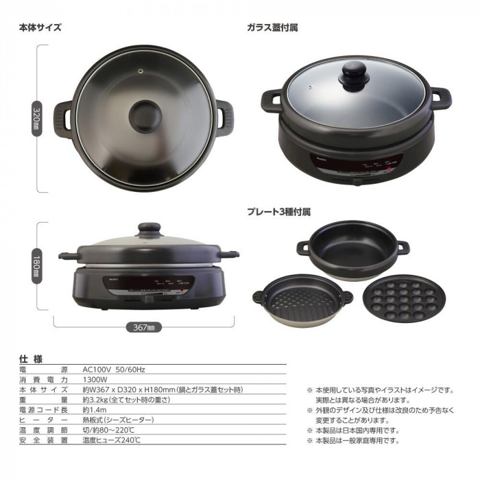 サイズ | 本体サイズ:約W367×D320×H180mm(鍋とガラス蓋セット時) 個装サイズ:32×18×33cm |