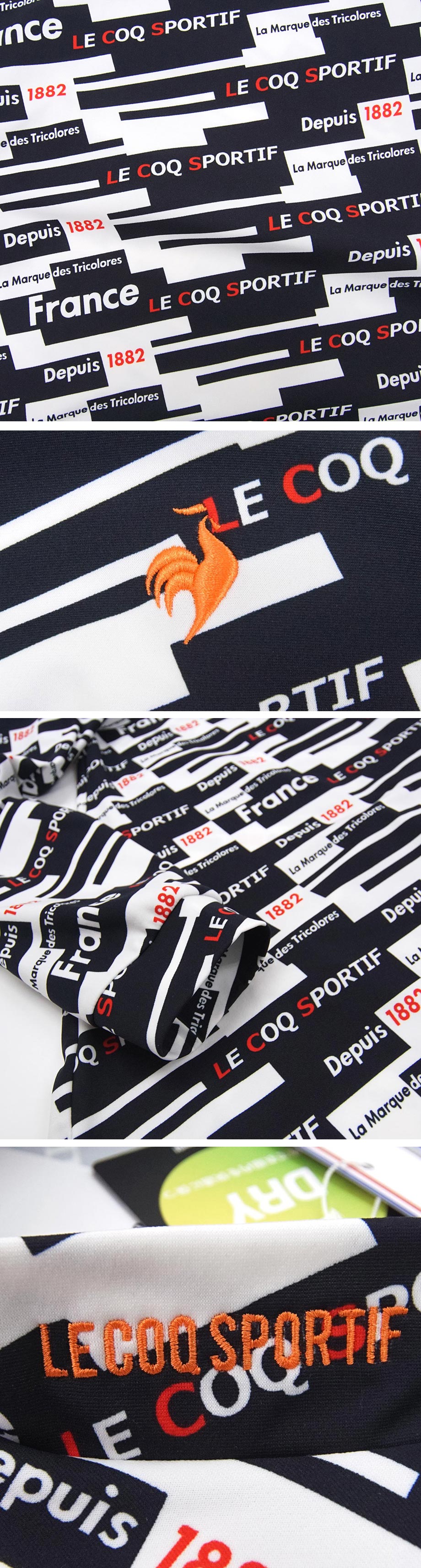 ●ブランド名などを大胆に配置した総柄が魅力。ゴルフウェアらしい気分もスコアも上がりそうな美しいデザイン。コントラストのはっきりとした色柄で華やかにロゴも引き立ちます。左肩にはお馴染みの雄鶏のロゴマーク刺繍、衿にもブランド名が鮮やかな刺繍で描かれています。