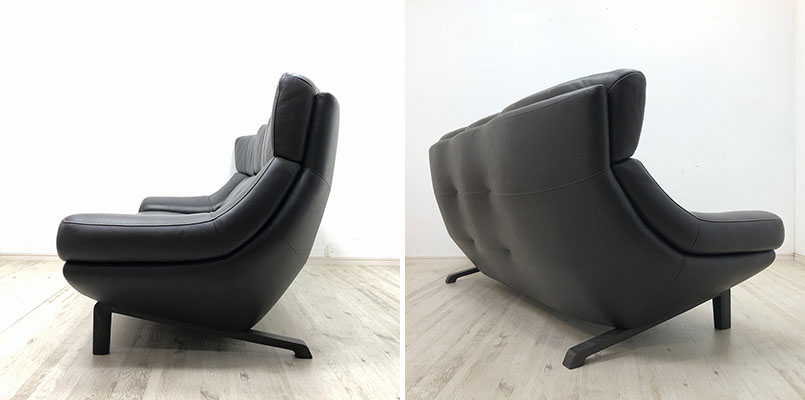 ■素材 主材:オーク(シアーブラック色) 表張材:内側/本革(牛)リーベル・ビターブラウン色 外側/合成皮革 ■サイズ(約) 幅204×奥行91×高さ89.5cm 座面までの高さ38.5cm ■生産国 日本 ■参考価格 399,300円(税込)