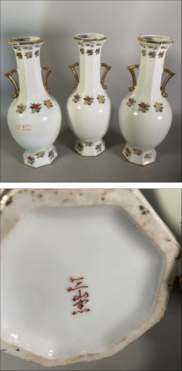 | K2-332 三山窯 創作 花柄陶器 耳付き マイセン風/ヘレンド陶磁器風 金彩 新古/展示品3点まとめ | ||