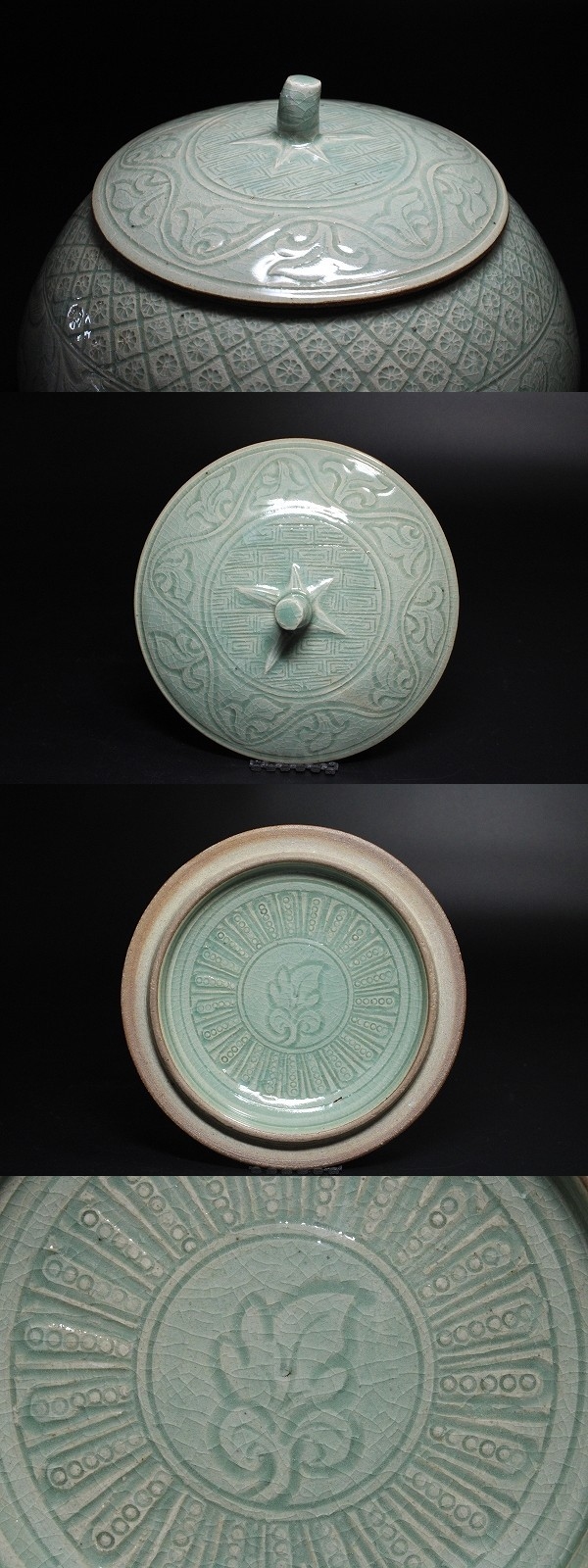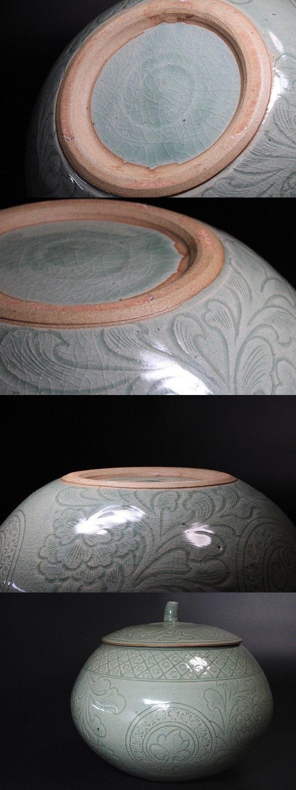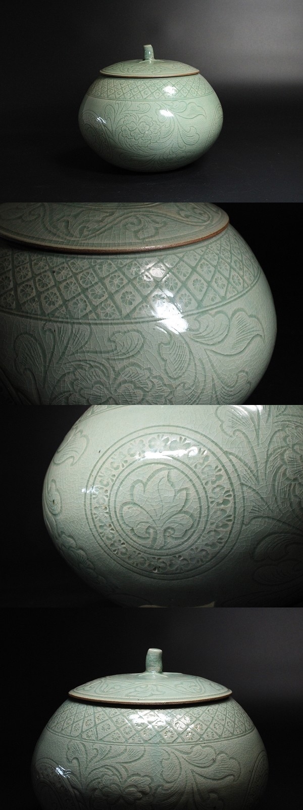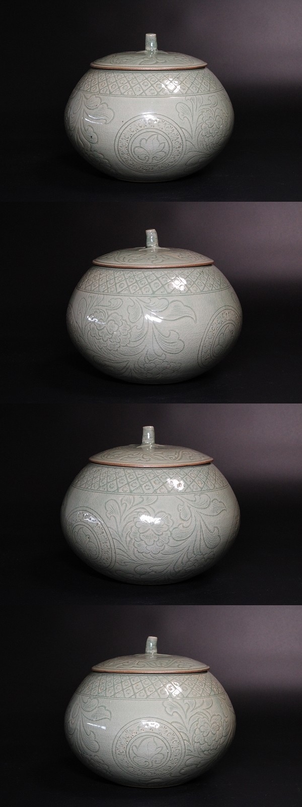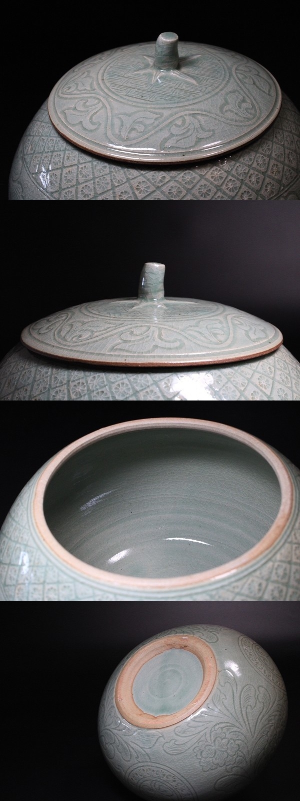 商品説明 | 状態 : 無傷 透き通る釉薬・陰刻の唐草・印花文と、とても完成度の高い逸品です。 中々お目に掛かれないと思いますので、この機会に是非如何でしょうか。 径 22.2cm 寸法 : 高さ 18.4cm 箱 : 共箱 |