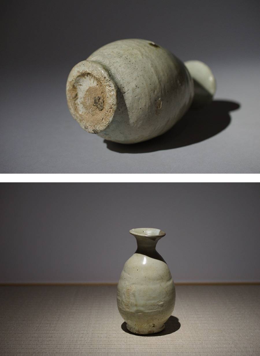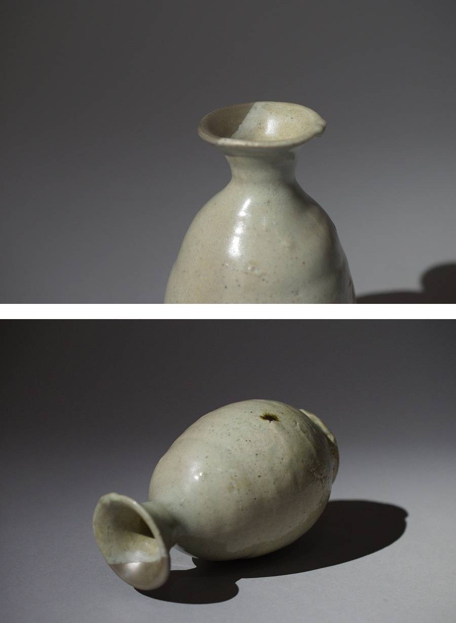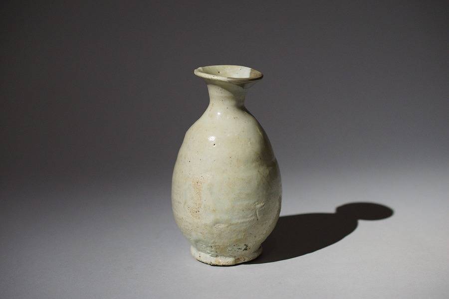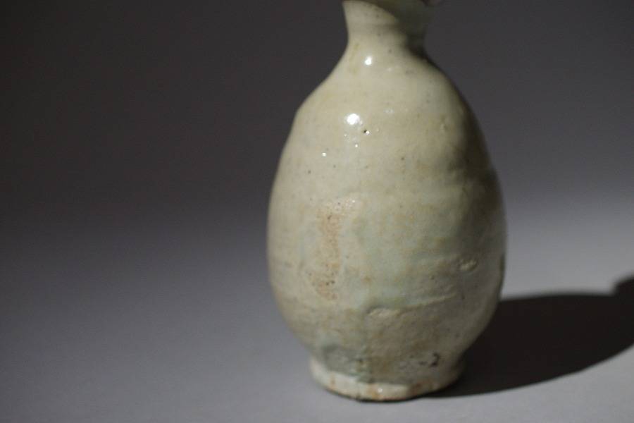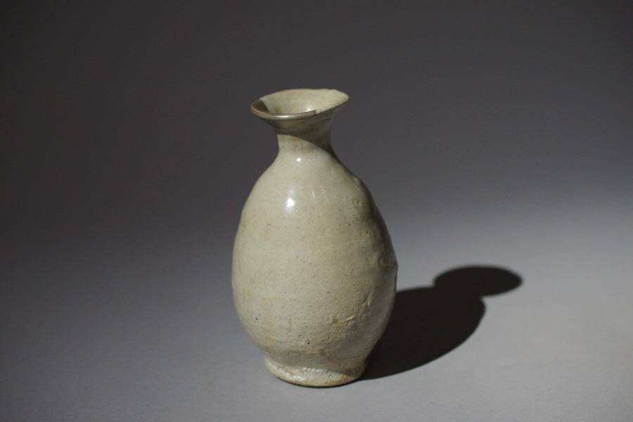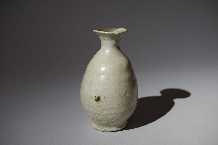 堅手徳利です。とろりとした肌が良い。まるで芋の子のような形もおもしろく、李朝ならではのおおらかさ。全体が歪んで、どの角度から見ても違いがたのしい。整った徳利より、酔い気分にふさわしいです。手取りはずしっと重く、見た目より容量は少なく、きっと下手な陶工が作ったのでしょう。捨てずに、そのまま焼いてしまえ、というところが、いかにも李朝らしさであり、数寄者の心をくすぐるものです。