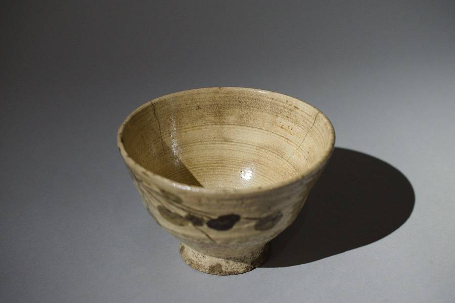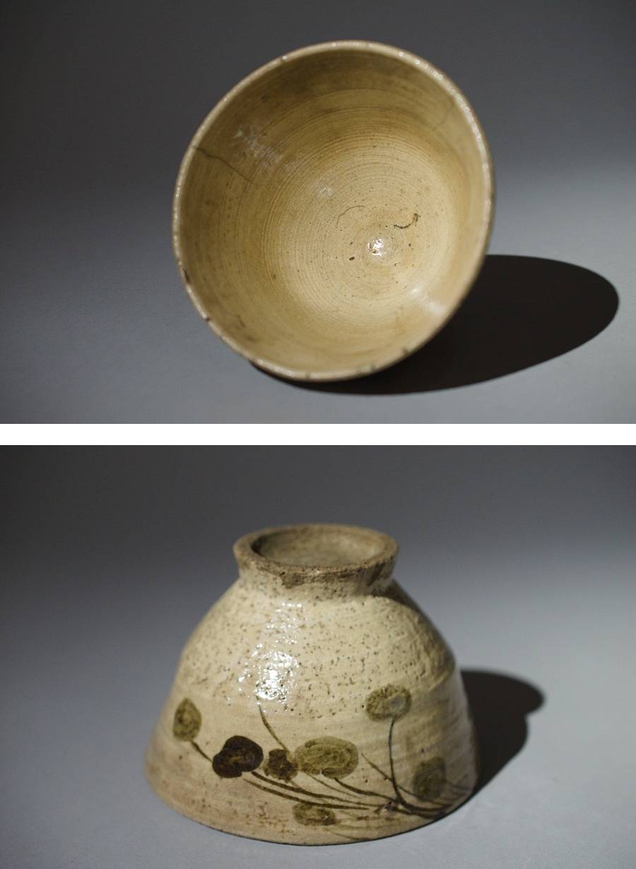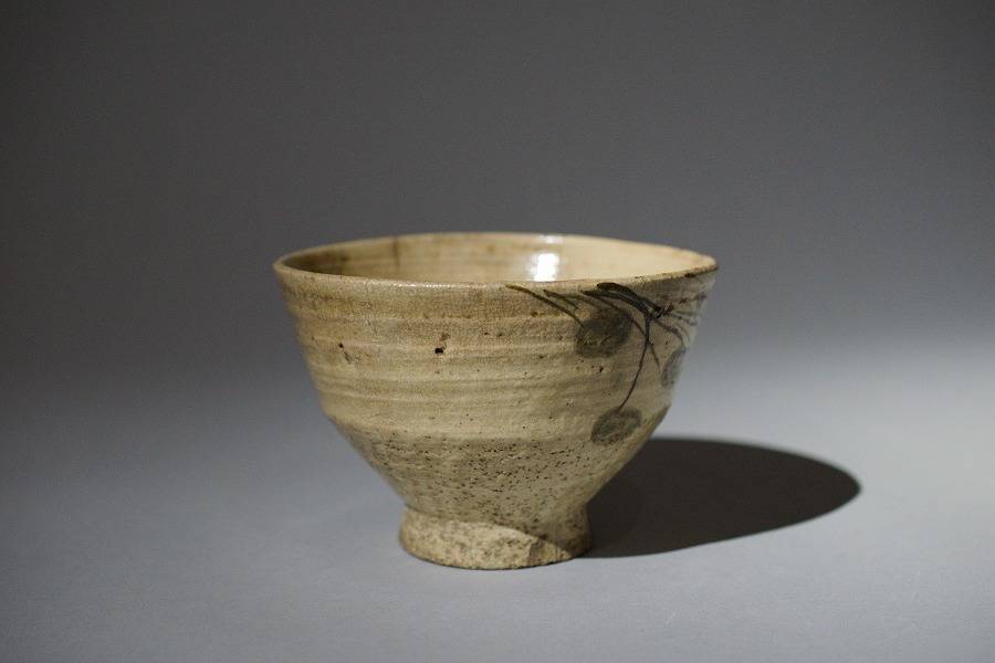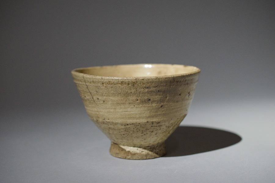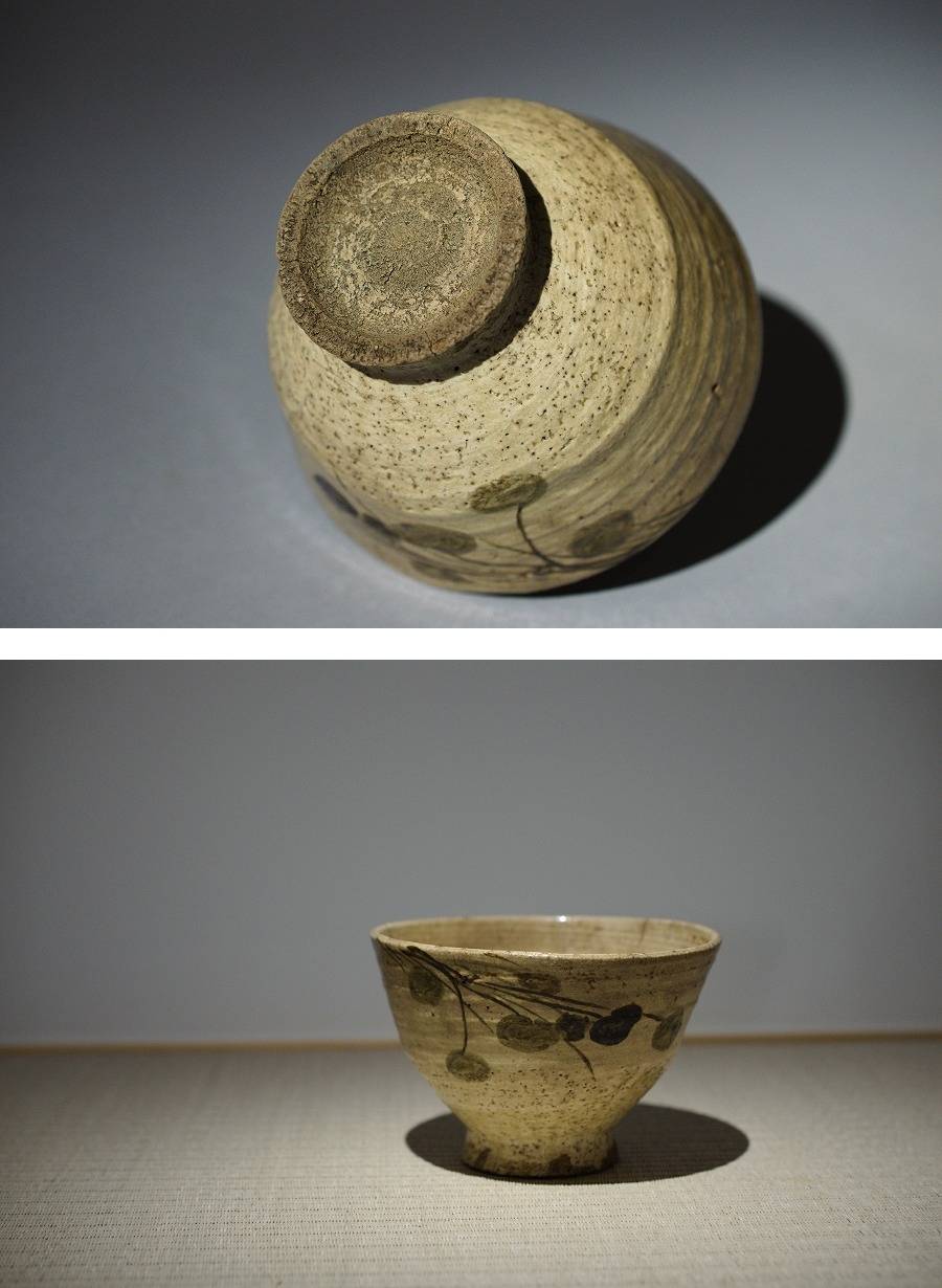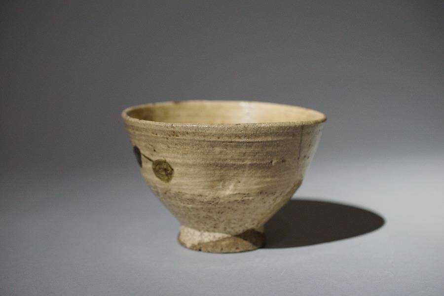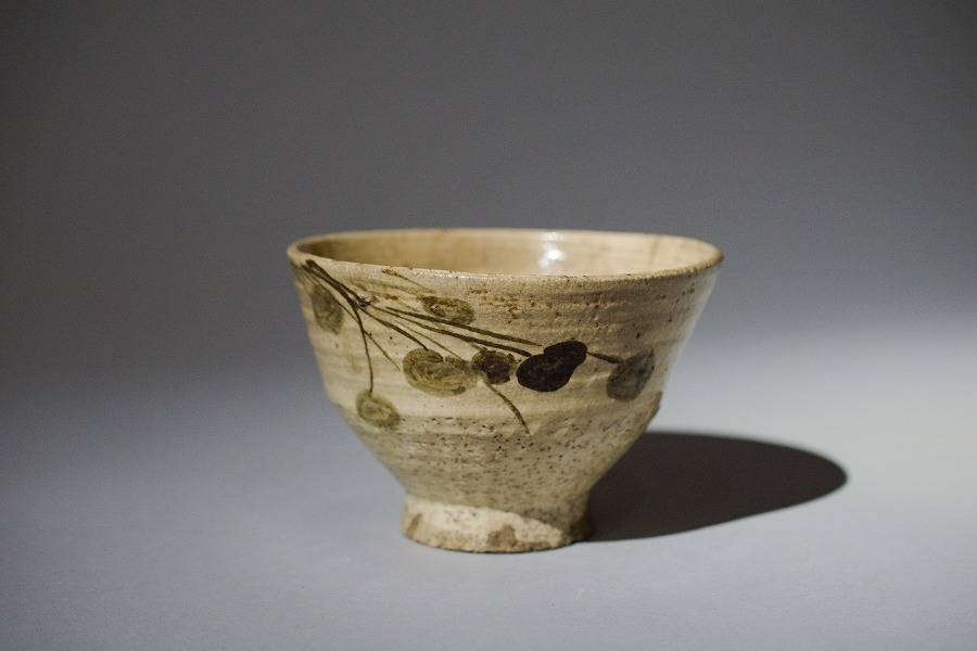 珍しい錆絵の施された古萩茶碗です。釉や土味から、江戸中期のものと判断しております。17世紀に上る可能性は、微妙なところでしょうか。作風に絵御本の影響が強いので、これを小堀遠州の美意識の反映と見ると、17世紀後半の可能性も捨てきれません。いずれにしても大変めずらしい古萩茶碗で、大阪の茶道美術商から120万円で購入した旨の名刺が残されております。今日の状況を鑑みるに驚くような値段ではありますが、茶道具がまだ高額であった頃の購入であったことと、希少性を評価された値付けであったことでしょう。