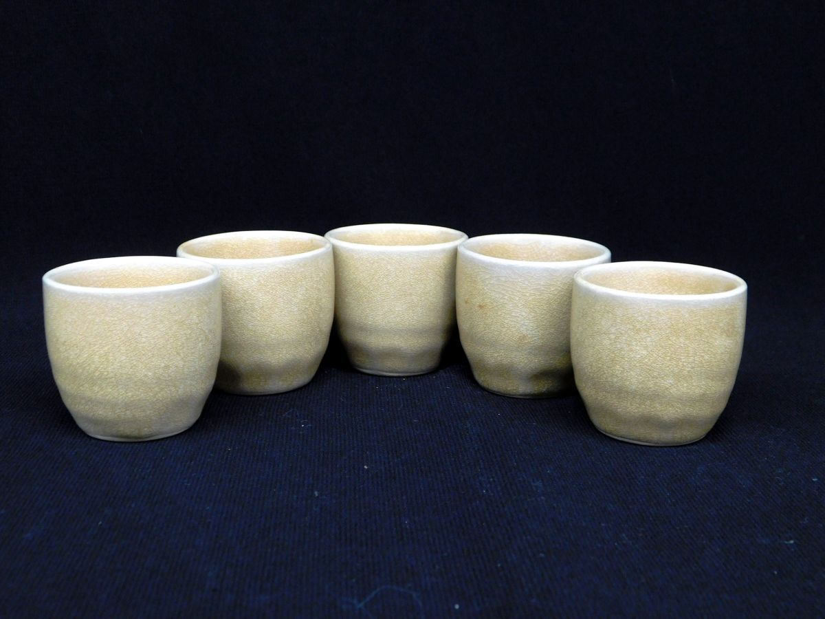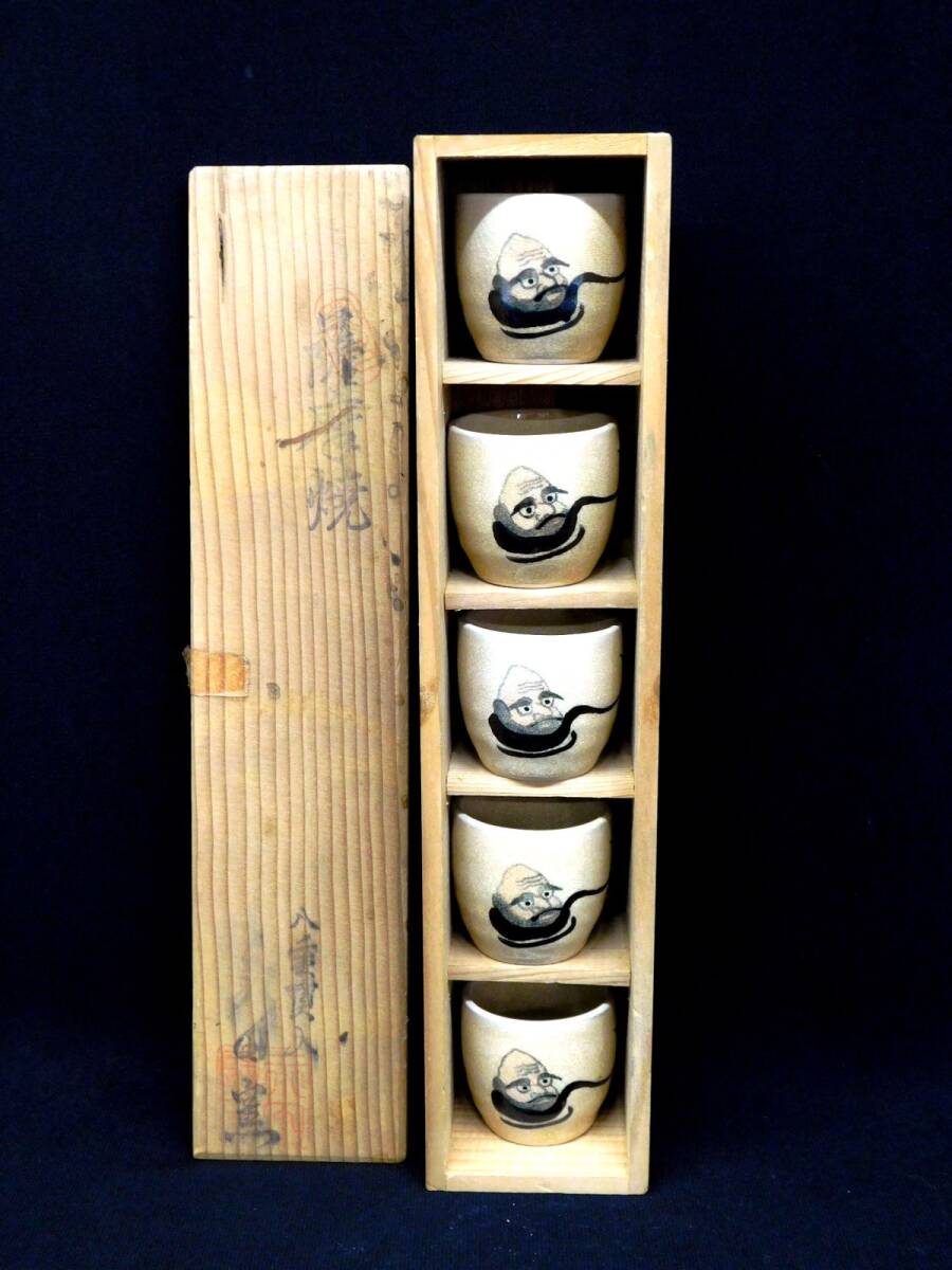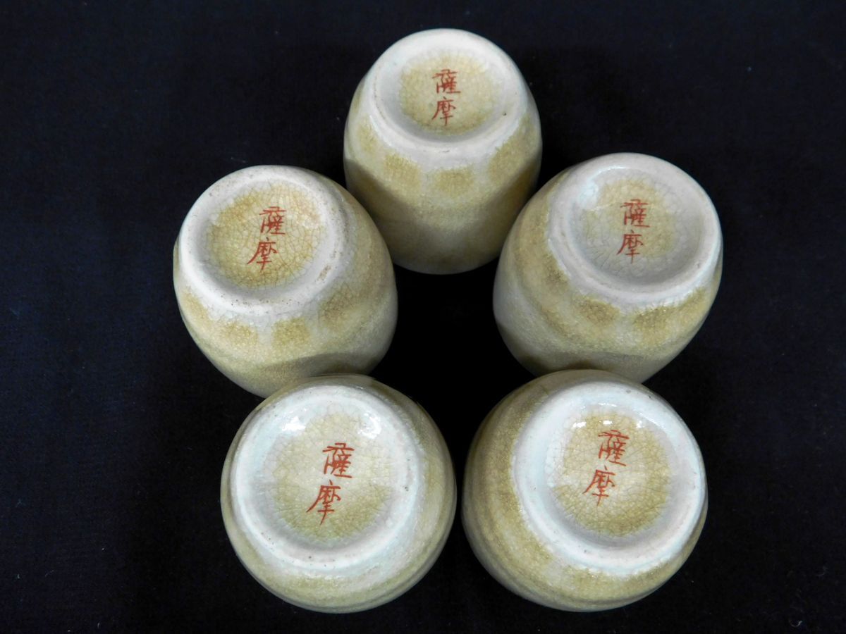 A802★薩摩焼 八重貫入5個 お猪口 ぐい飲み 酒器 共箱 〇田窯 陶芸 工芸品 美品 サインあり★送料780円~ 收藏