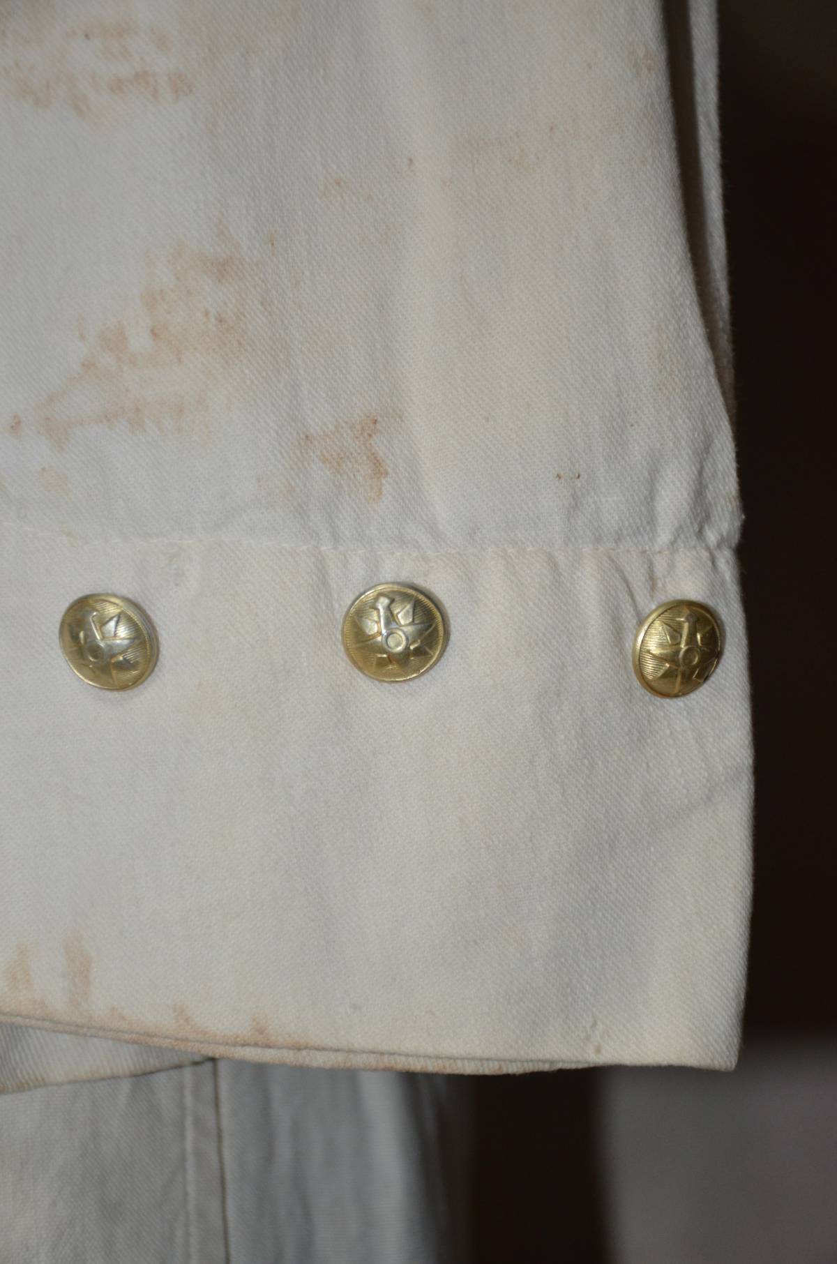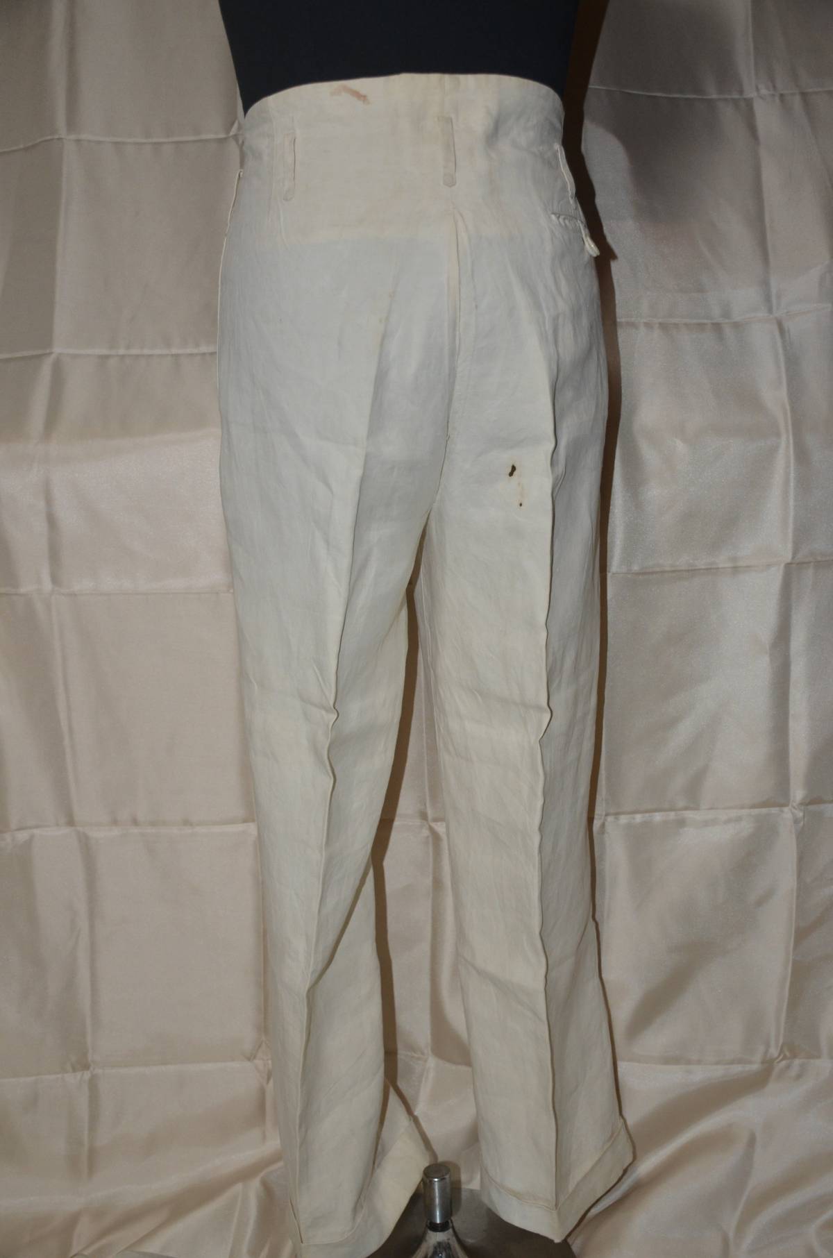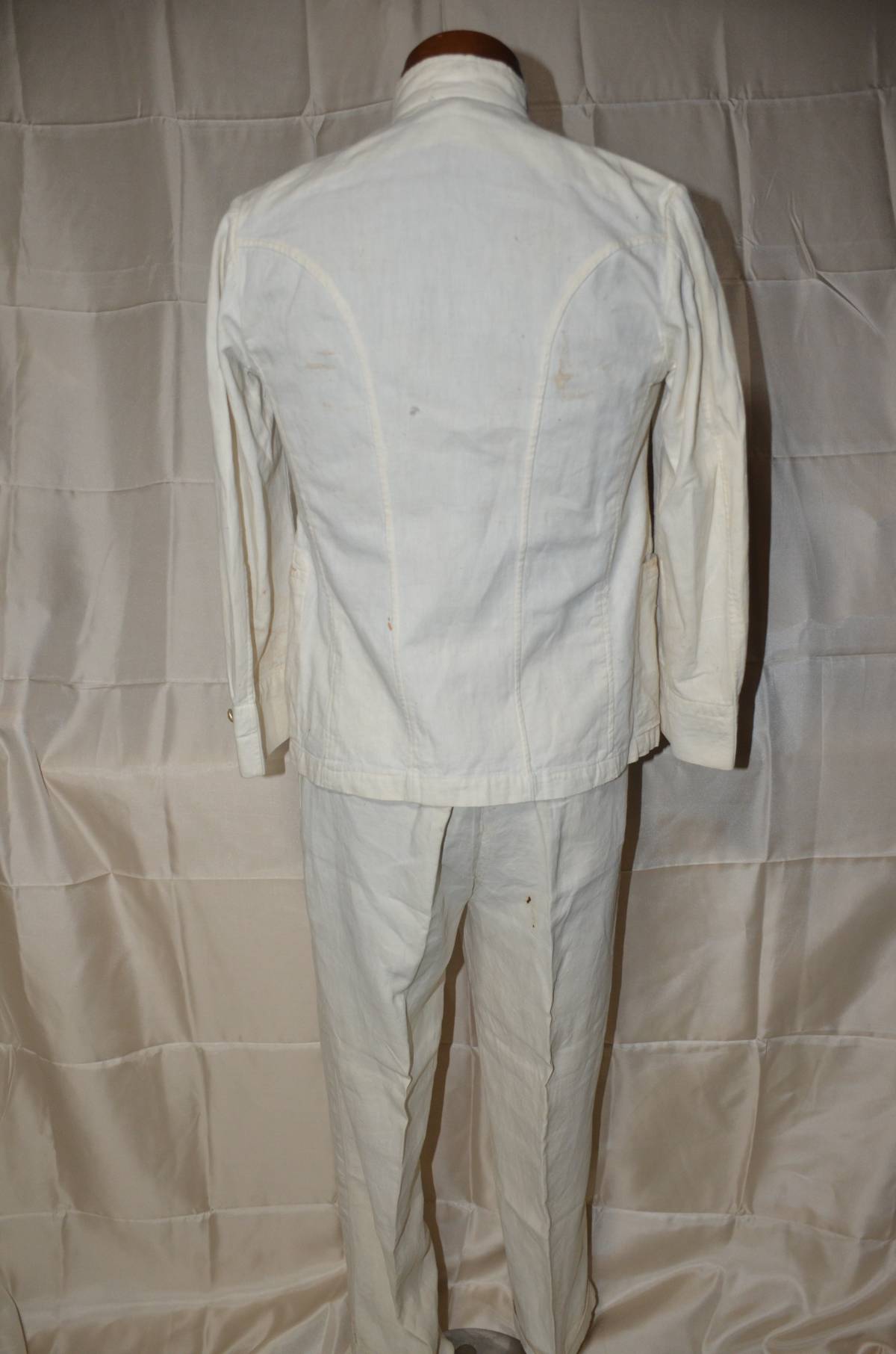 海軍予備学生二種上衣下衣です。襟の裏に「二期生徒 記名」があります。高等商船学校勤務者に、軍艦操船、砲術などの教育を施して、有事の際は少尉甫として採用した制度です。第二期は昭和10年に15名卒業し、退官後商船の航海士等に勤務しました。昭和16年の開戦までに世界の海を航海しており、軍艦の航海士では得られない、「仮想敵国国家」の港の入港も習熟していました。襟に真鍮の襟章が付き、袖に2号ボタンが3個付けられています。兵学校の二種服に似ていますが、肩章ループが無く、検定布も無いので、特注した可能性があります。サイズは、肩幅40センチ、袖上部線52センチ、袖下部線42ンチ、襟上部から裾まで63センチ、脇45センチ、ウエスト78センチ、股下70センチです。本文下の追加写真もご覧ください。ヤマト運輸宅急便で、全国一律700円でお送りさせていただきます。