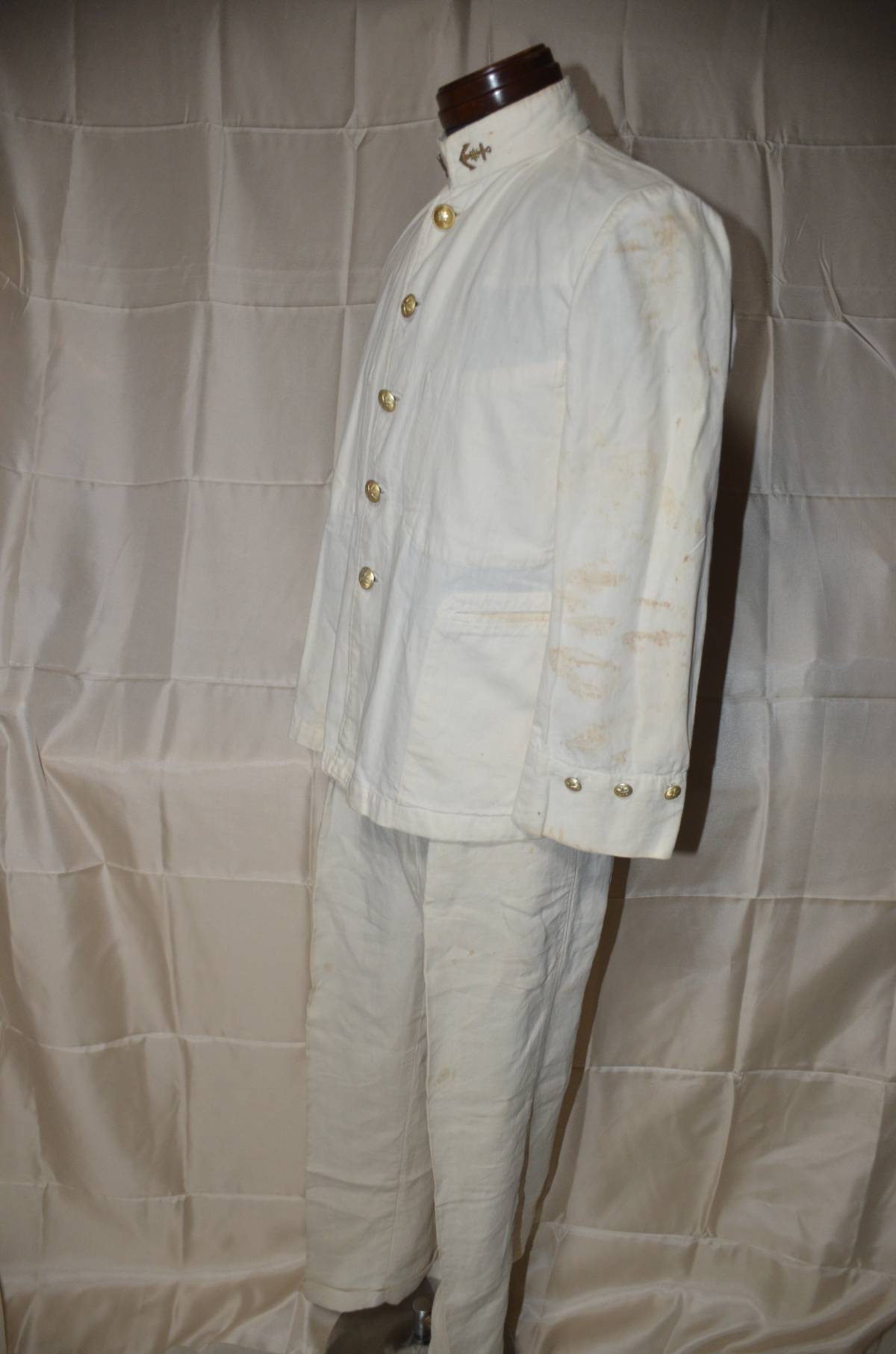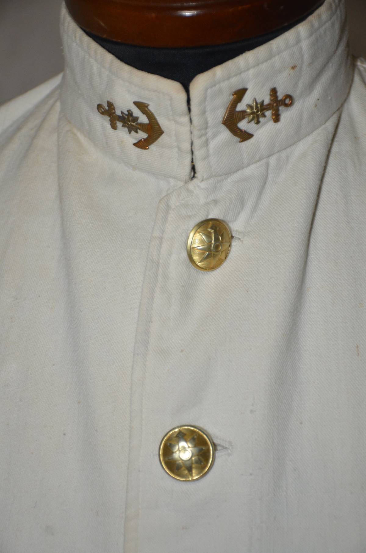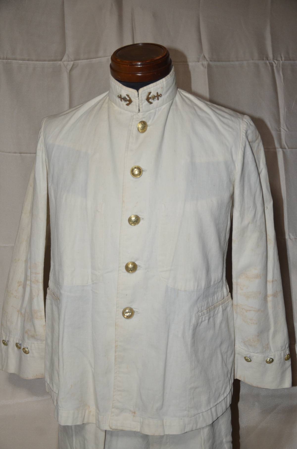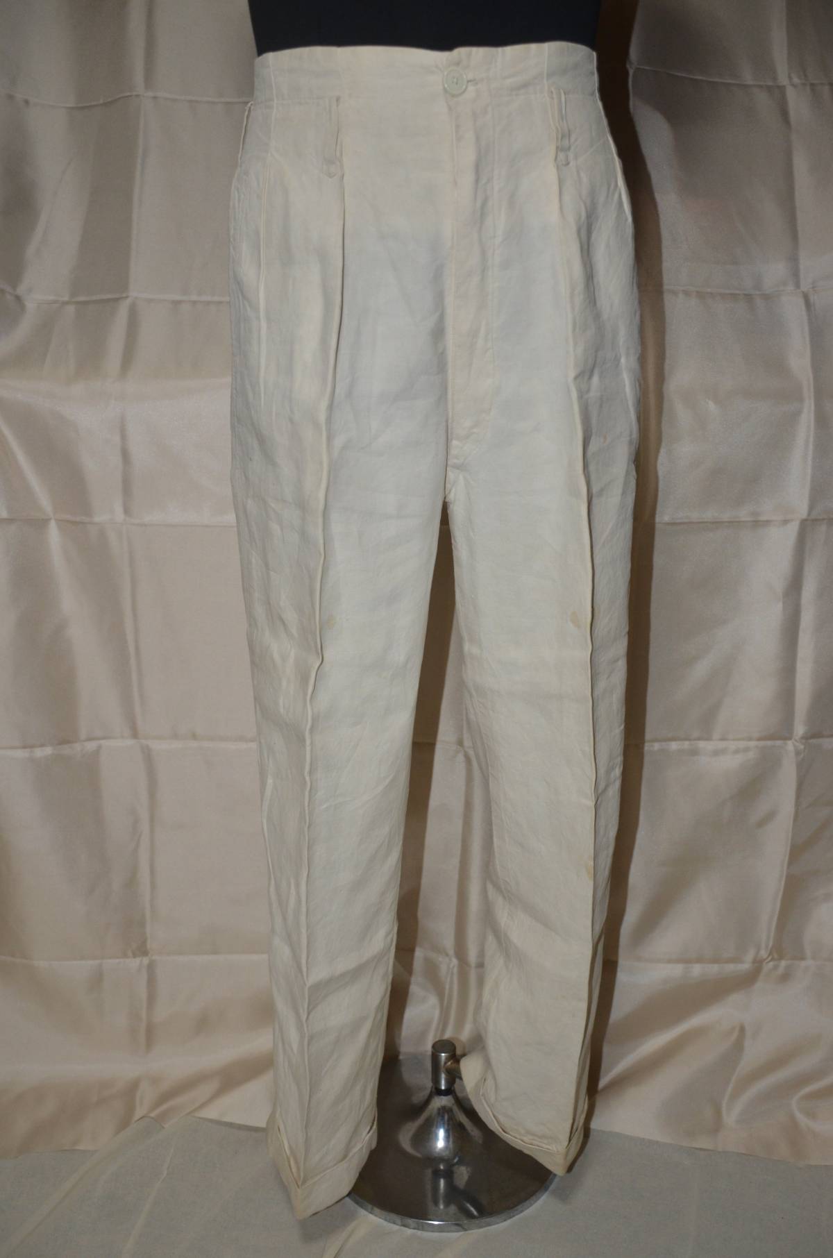 海軍予備学生二種上衣下衣です。襟の裏に「二期生徒 記名」があります。高等商船学校勤務者に、軍艦操船、砲術などの教育を施して、有事の際は少尉甫として採用した制度です。第二期は昭和10年に15名卒業し、退官後商船の航海士等に勤務しました。昭和16年の開戦までに世界の海を航海しており、軍艦の航海士では得られない、「仮想敵国国家」の港の入港も習熟していました。襟に真鍮の襟章が付き、袖に2号ボタンが3個付けられています。兵学校の二種服に似ていますが、肩章ループが無く、検定布も無いので、特注した可能性があります。サイズは、肩幅40センチ、袖上部線52センチ、袖下部線42ンチ、襟上部から裾まで63センチ、脇45センチ、ウエスト78センチ、股下70センチです。本文下の追加写真もご覧ください。ヤマト運輸宅急便で、全国一律700円でお送りさせていただきます。