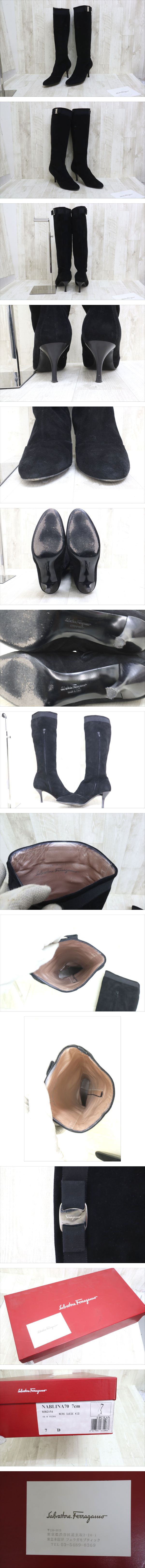 【ト萬】◎Salvatore Ferragamo ヴィラリボン スウェードレザー ロングヒールブーツ (7D) ブラック ※使用感あり SA000RNP17 收藏