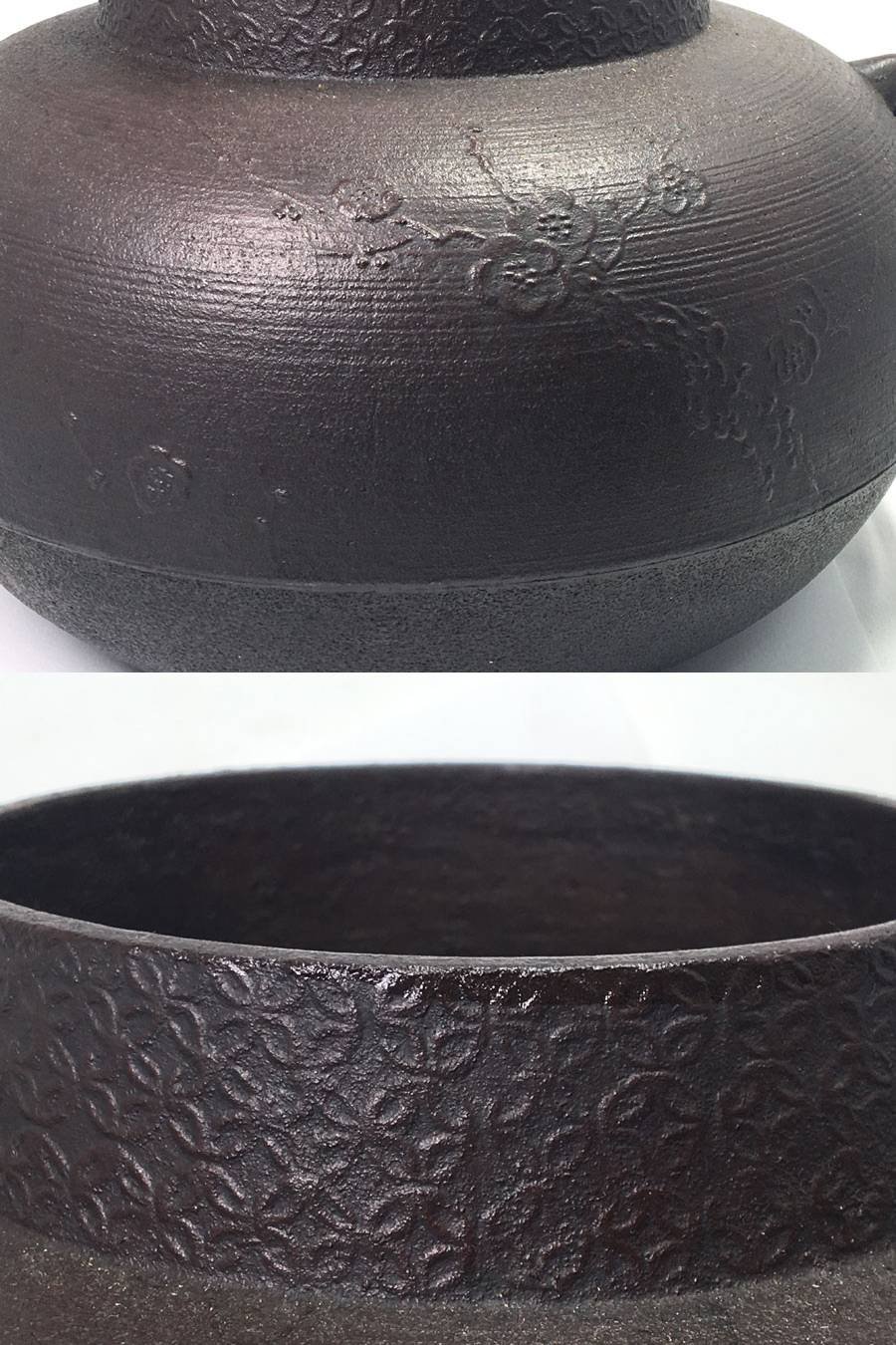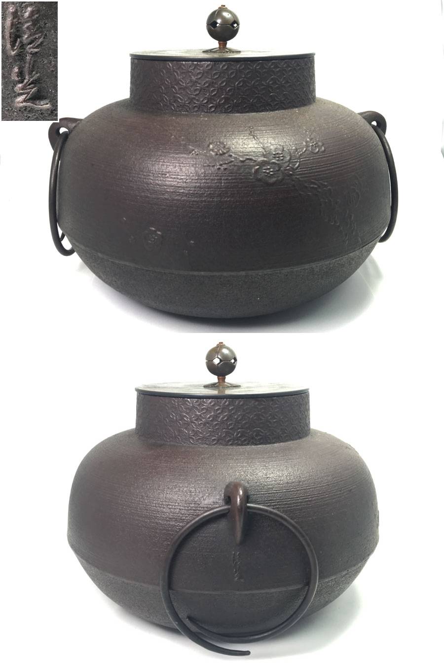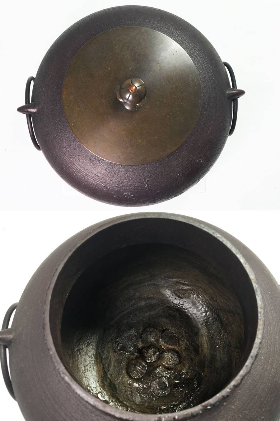 釜師 佐藤清光 清光作 蝋梅 梅地文 炉釜 茶釜 風炉釜 鉄製 銅蓋 釜 鐶 約4.2kg 水漏無 茶道具 金属工芸 收藏