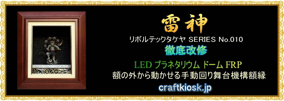 ●当工房で考案し、製作致しました、世界でも類を見ない、LEDプラネタリウムの背景、額に入れたまま、フィギュアの向きを変えることのできる回り舞台機構、境目のない自然な情景を可能にする、ドーム状の裏出し。
