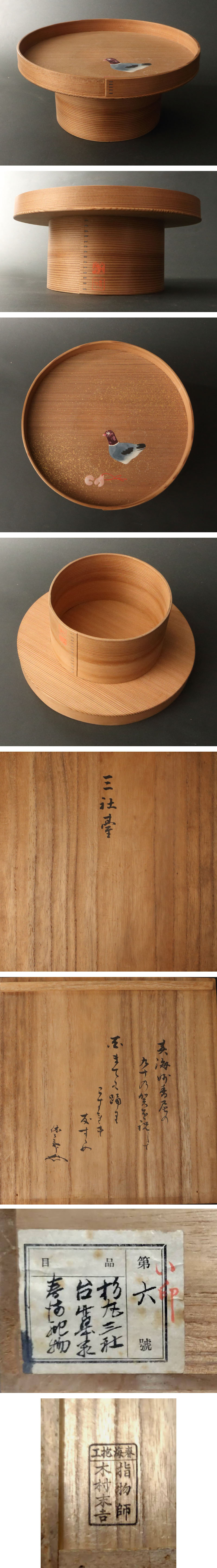 【深和】木村末吉 杉木地鳩絵丸三社台 藪内休々斎句銘「春海妙香尼の九十の賀を祝して」共箱 保証品(春海商店 藪内流 宗匠 曲物 菓子器) 收藏
