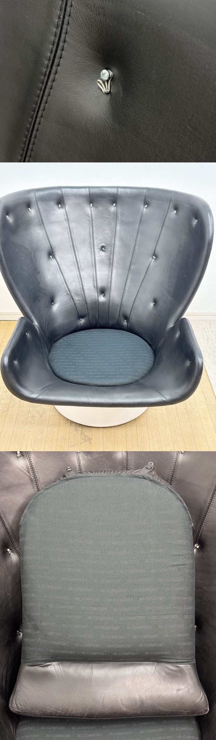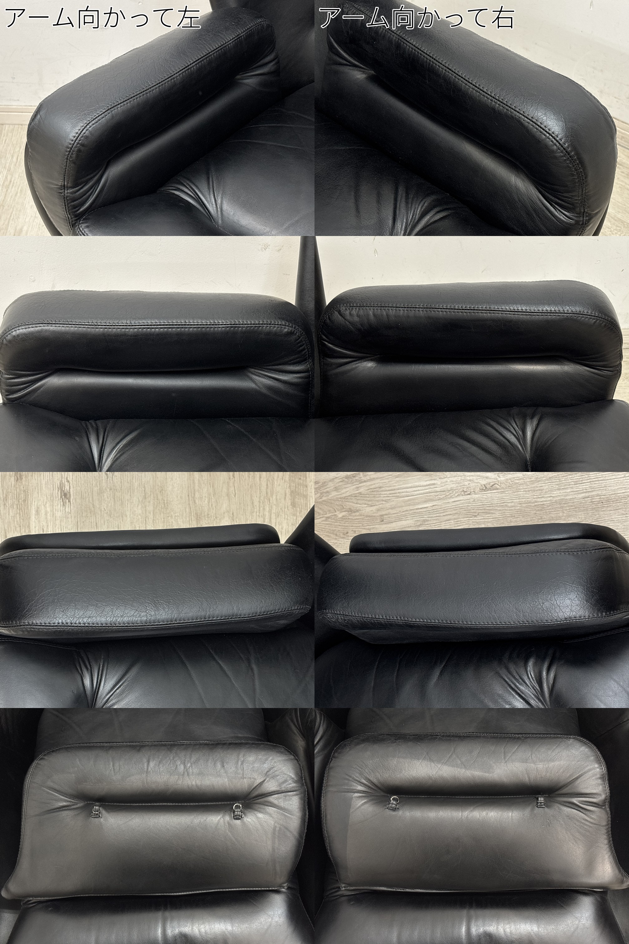 こちらは コンフォルト COMFORT エルダ 1人掛けソファ です。 中古 ワンオーナー品です。 【COMFORTについて】 COMFORT/コンフォルト(現:LONGHI)は、イタリアのメーカー。 提供する家具アクセサリー、ガラス製の間仕切り、室内ドア、ソファなどの 多様なアイテムを、グローバル企業戦略のもとで生み出しています。 嗜好の変化に配慮しながらも、製造業のルーツを深く持っており、 その過程では、プロトタイプの開発や応用技術からカスタマーサービスやコミュニケーションまで、 生産プロセスのあらゆる側面に対応する一貫したものとなっています。 【Joe Colomboについて】 Joe Colombo/ジョエ・コロンボ(1930-1971)はイタリア、ミラノ生まれのインダストリアルデザイナー。 1951年に前衛美術集団モヴィメント・ヌークレアーレを結成しアーティストとして活躍。 1962年ミラノに自身のデザイン事務所を開設し、同年オールーチェ社より発表した「アクリリカ」でコンパッソ・ドーロを受賞。 その後、ベルニーニ、カルテル、コンフォルト、アリタリア航空などで多彩なプロダクトを手掛け、 1970年に発表した「ボビーワゴン」はMoMAのパーマネントコレクションとして収蔵される名作でコロンボの代表作となります。 1971年にこの世を去るまでわずか10年程の間に数々の名作を残し、 60年代のイタリアンミッドセンチュリーモダンを彗星のごとく駆抜けていったデザイナーです。 今回はそんなCOMFORTの、ヴィンテージの1人掛けソファが入荷しましたので出品致します。 こちらのお品は、ブラックレザーが特徴的な1人掛けソファです。 本体はホワイトの一体型FRPのフレームにインパクトのある大型クッションが配置されています。 このようなFRP製大型ソファとしては業界初となります。 滑らかなシルエットの背もたれの内側には、身体を両脇から包み込むための7つのクッションが取り付けられています。 台座は、土台部分が回転式となっており、ホームシアターや書斎に適しています。 レザーには画像のような、風合いが現れています。 このエルダチェアは1963年にデザインされ、1965年にコンフォート社から製品として発売されました。 現在では新品が製造されておらず、ヴィンテージ市場でのみ取引をされています。 デザイナー、ジョエ・コロンボ氏は、しばしば親しい間柄の人間に、”優しくて包み込まれるような存在”という意味で 妻のことを「ソファのような女性」と紹介をしていたそうです。そしてこのソファを夫人の名前、 ”エルダ”より名付けたといったような、氏のプロダクトへの愛着を感じられるエピソードもあります。 その他、詳細につきましては、以下の画像も合わせてご覧ください。 レザークッションは金具で固定されていますが、一部は取り外し可能となっております。 3枚目は座面クッションの裏側です。 【座面クッションを取り外した図】 【コンディションについて】 コンディションにつきましては、ワンオーナー品で、 前オーナー様は当時百貨店にて新品購入されたとのことです。 詳しい状態については以下の画像も併せてご覧ください。 【アーム拡大図】 【FRP樹脂部】 一部に画像のような、わずかな小キズがございますが、 基本的には綺麗な状態となっています。 【座面奥 布部のわずかなスレ痕】 【座面 腰掛けた際のシワの様子】 使用感に伴い、画像のようなわずかな小キズやなどがあります。 しかしながら中古品のソファにありがちなニオイ残りやへたりなどはさほど感じられず、 回転もスムーズに行えました。 まだまだ長きにわたってお使いいただけるお品です。 ※弊社提携業者にて再塗装を行っておりますが、当時物のヴィンテージのレザーのため、 定期的にご落札者様の手によって革に栄養を与えるなどメンテナンスを行うことをおすすめします。 本物のヴィンテージ家具がお好きな方におすすめのお品です。 是非この機会にご検討ください。 皆様のご入札をお待ちしております! 再良市場の他のお品物はこちらから!