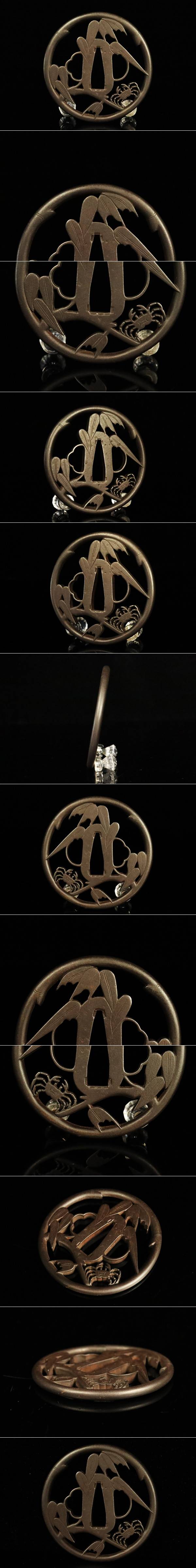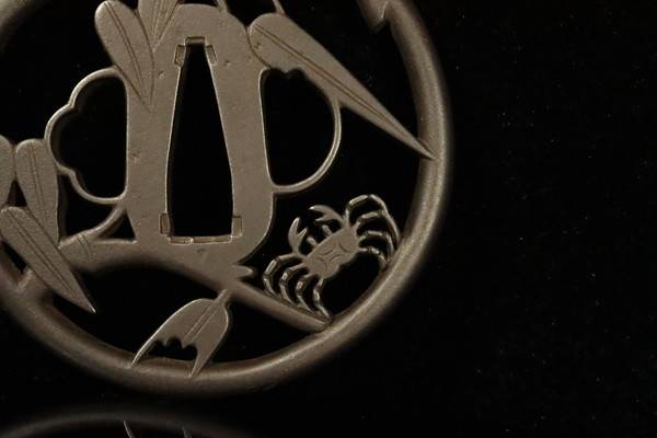 【ASAHI】江戸時代 鉄地 蟹透かし丸形鍔 繊細な技巧 7.9cm 肥後鍔 日本刀 鐔 時代武具[71159qe] 收藏
