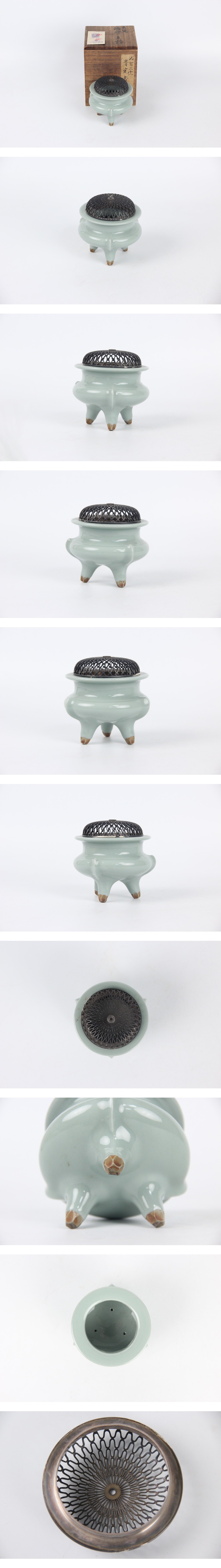 諏訪蘇山 二代 青磁 三足袴腰香炉 香道具 茶道具 純銀透彫 菊 花 火舎重量64g 共箱 旧家所蔵品 ED5-5 收藏