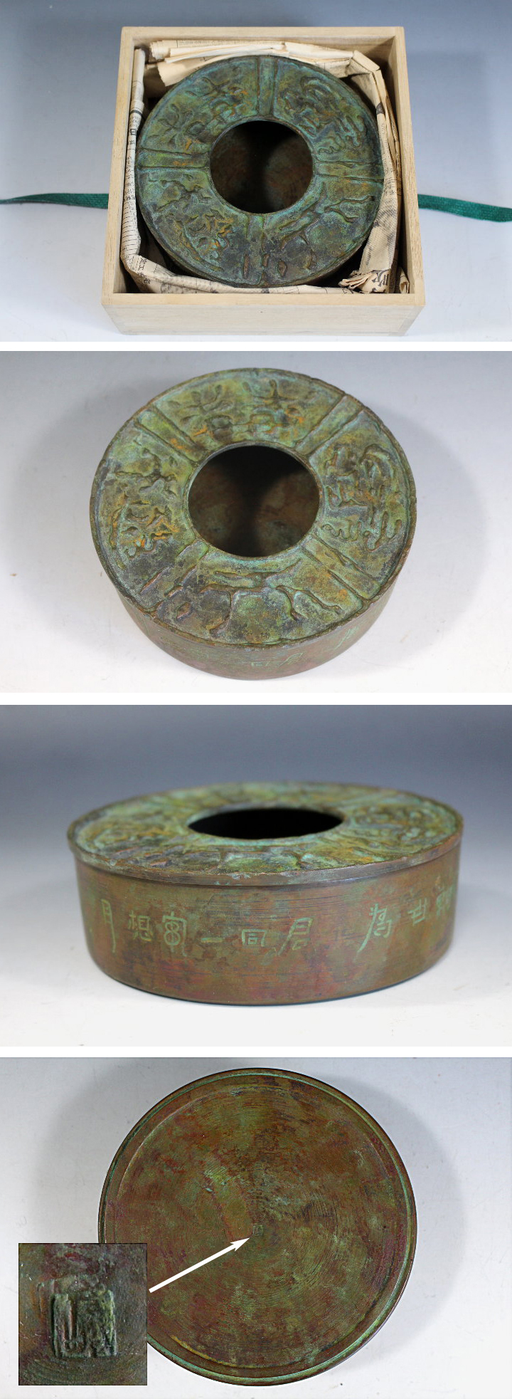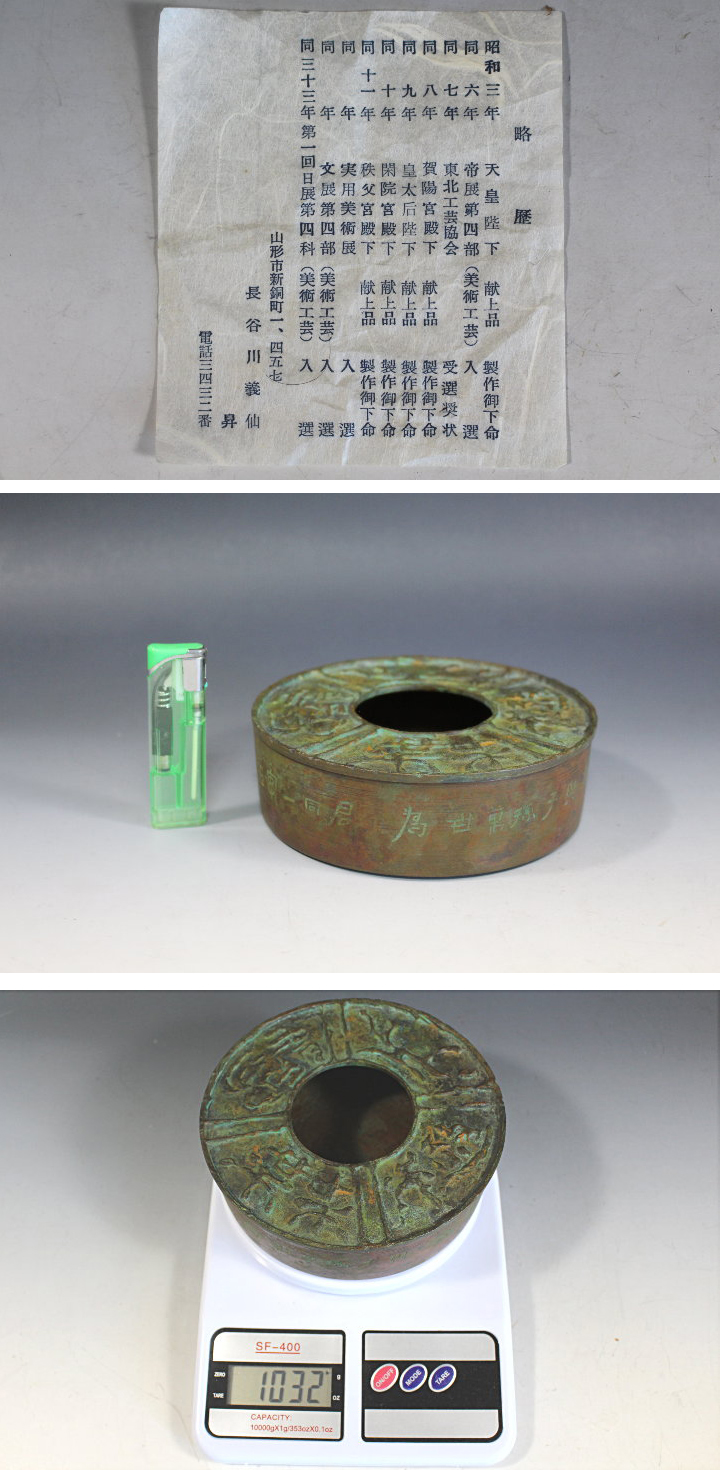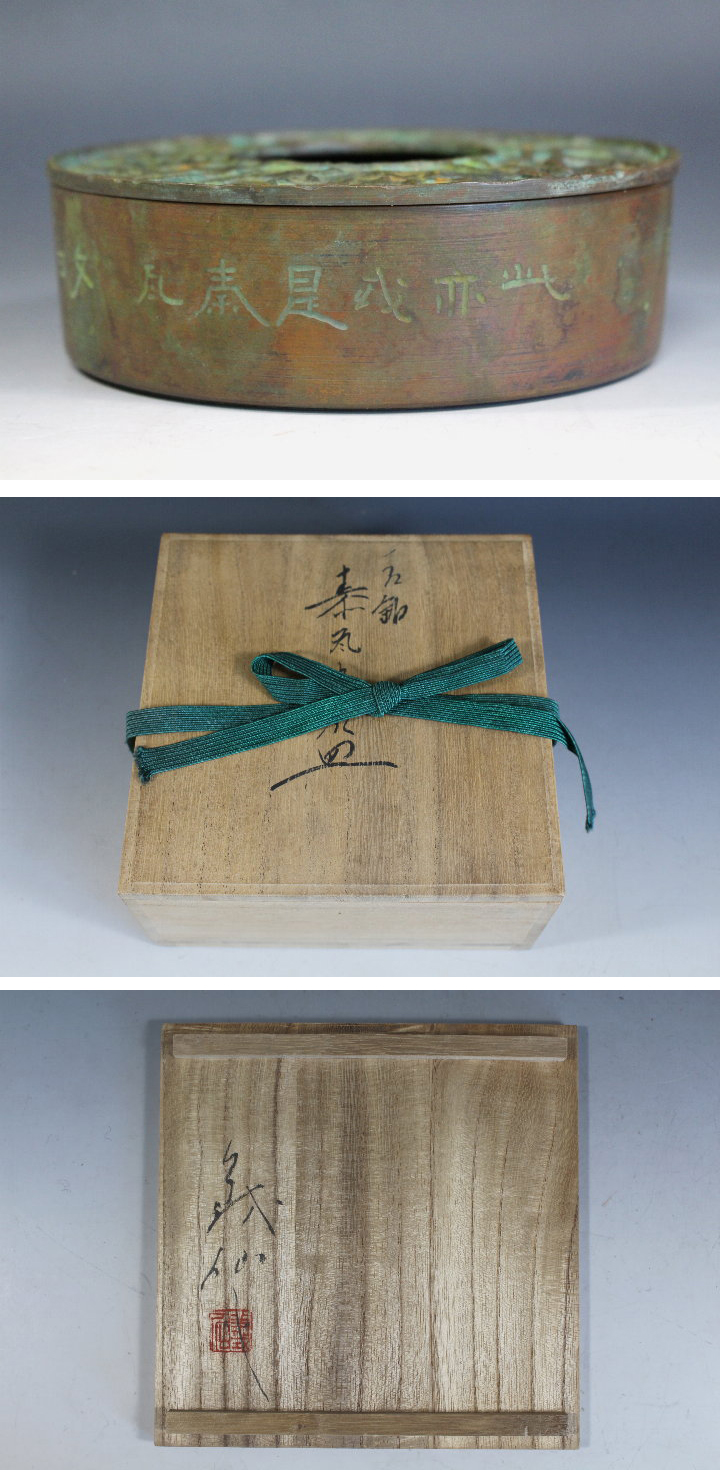 サイズ:径14.8cm 上部に「興天無極」瓦当を模した青銅の灰皿です。 側面には 文曰興天無極 興子孫萬世為~ が刻されています。 作者は山形の長谷川義仙(昇)氏 共箱です。 天皇陛下の献上品などを製作しています。 灰皿とありますが「筆洗」などに使用してはよいのでは・・・ 戦前の作品だと思います。 写真をご覧の上ご入札宜しくお願い致します。 | |
