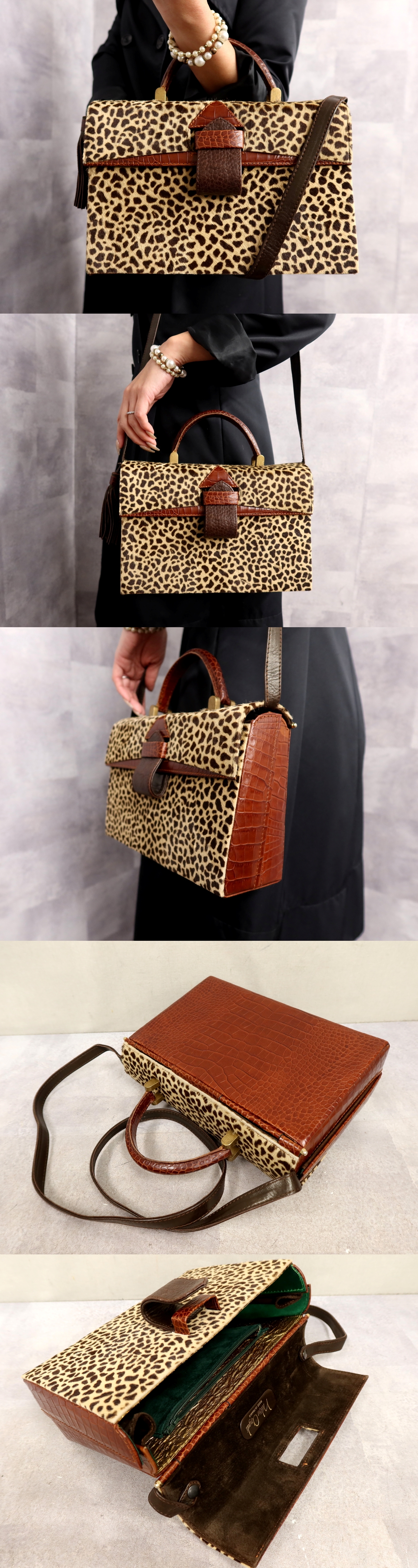 ●超美品●HELENE ANGELI ヘレンアンジェリ●レオパード柄●ハラコ クロコダイル 型押し レザー●2way ハンド バッグ●ブラウン系●Js63474 收藏