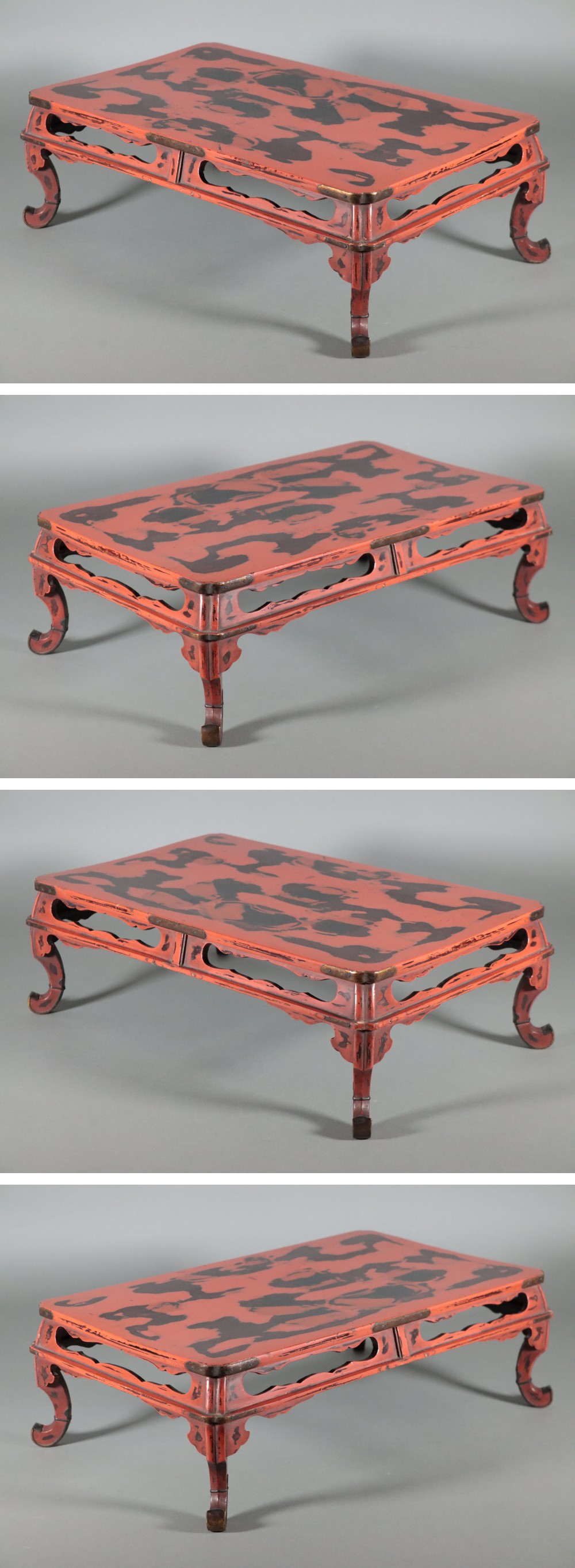 時代物 / 伝統工芸 根来塗 根来 春日卓 共箱 / 真鍮 飾金具 / 漆器 堅牢 下地 木地 黒漆 朱漆 四足 花台 骨董品 古美術品 / 幅51,8cm 收藏