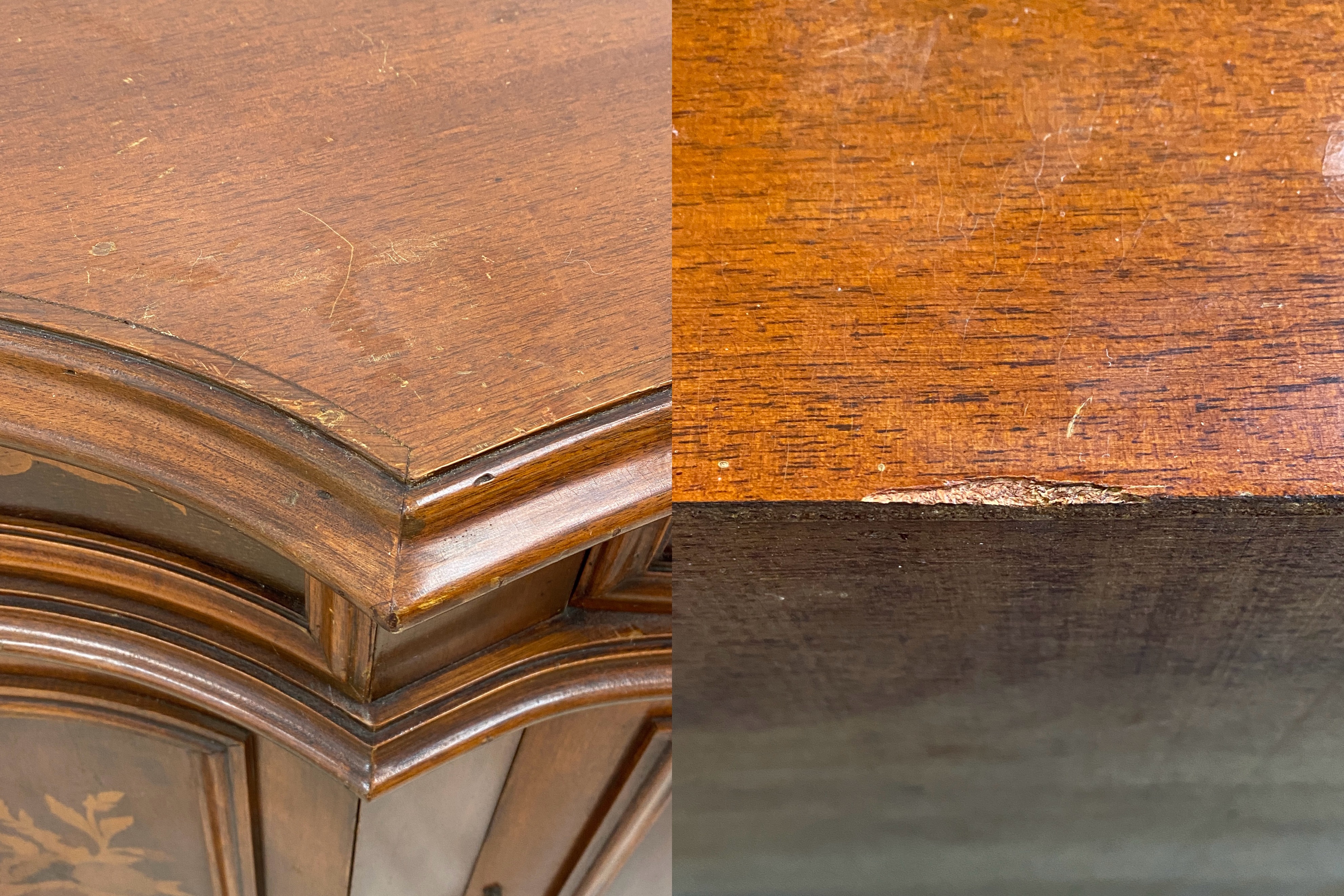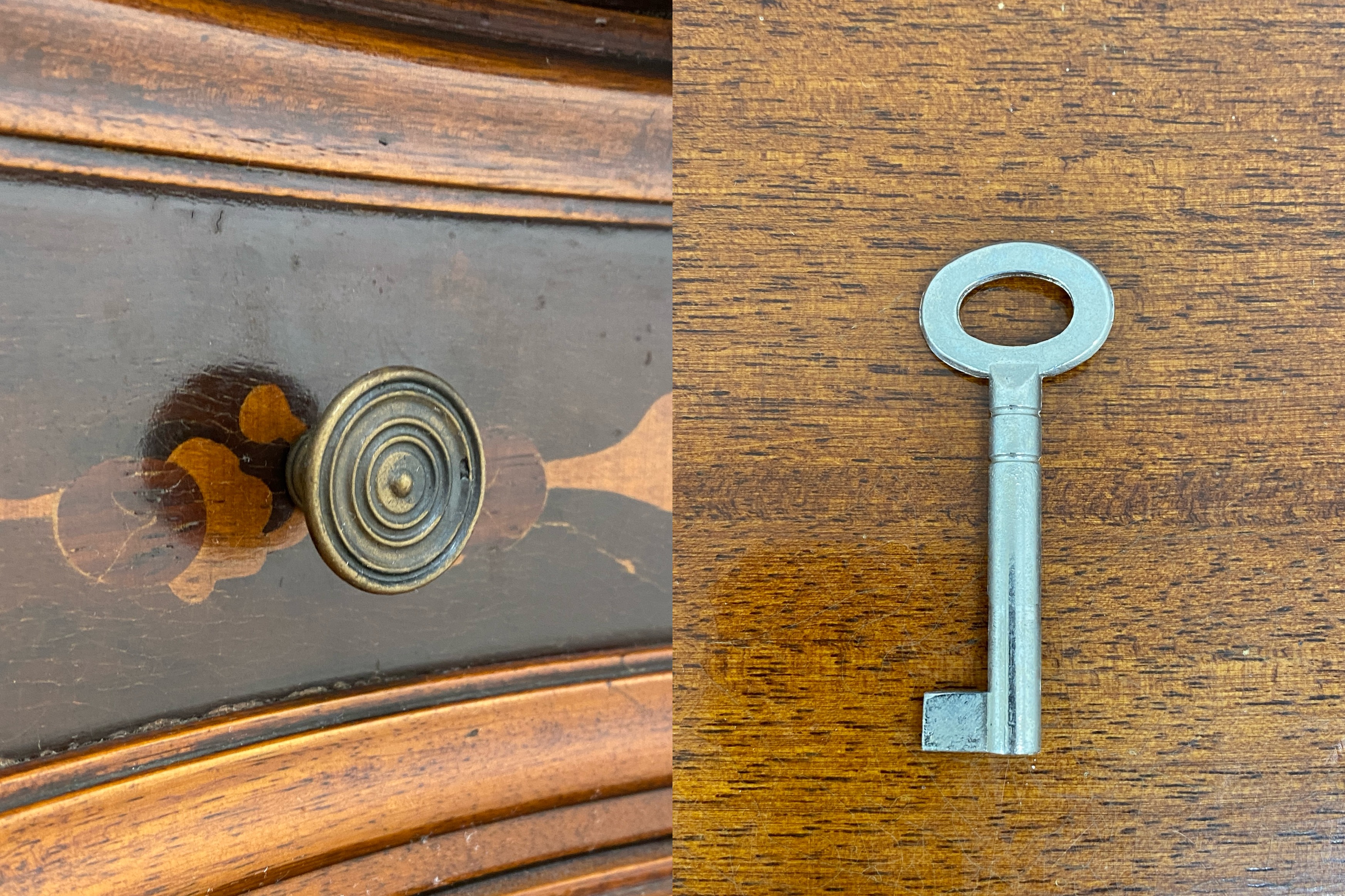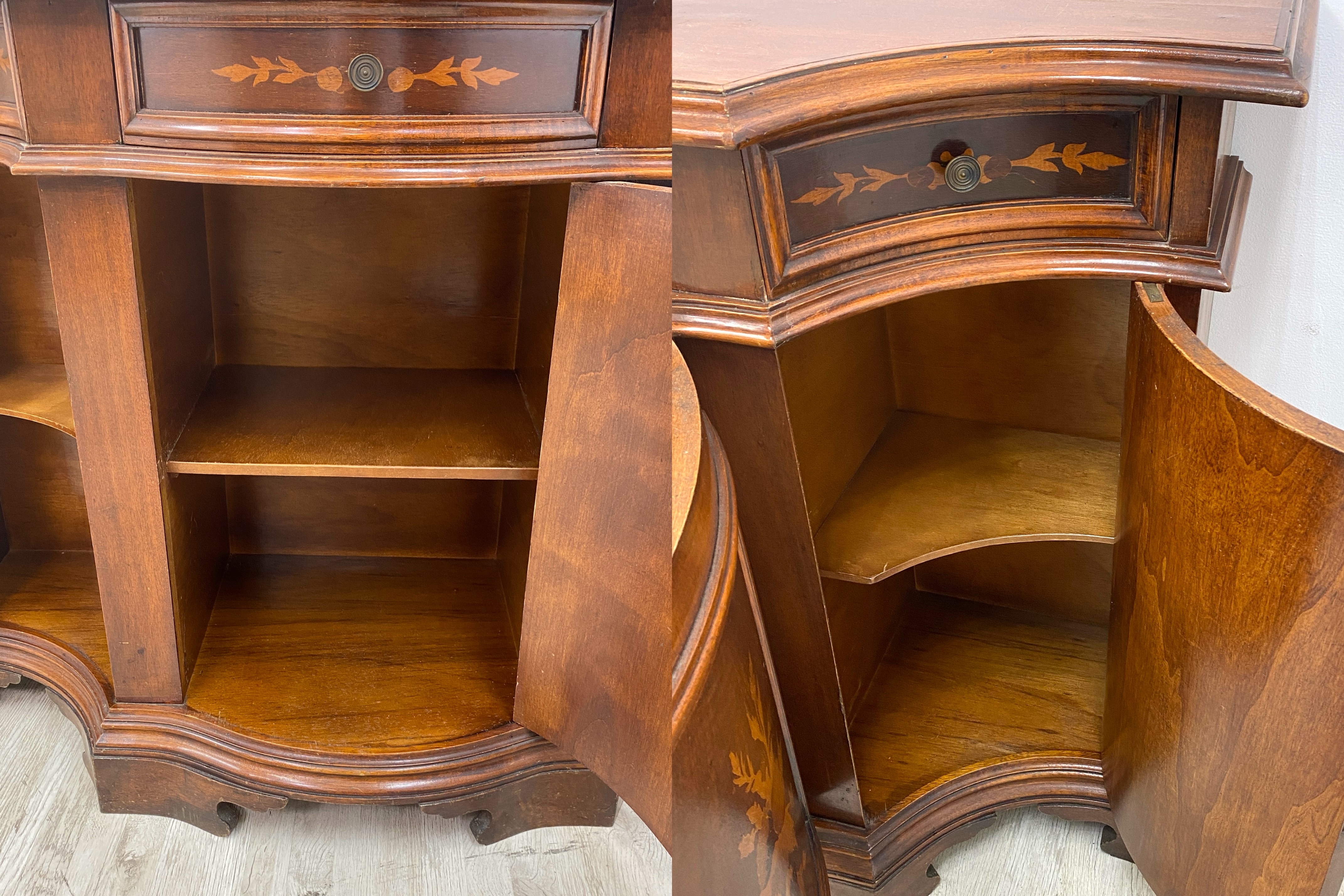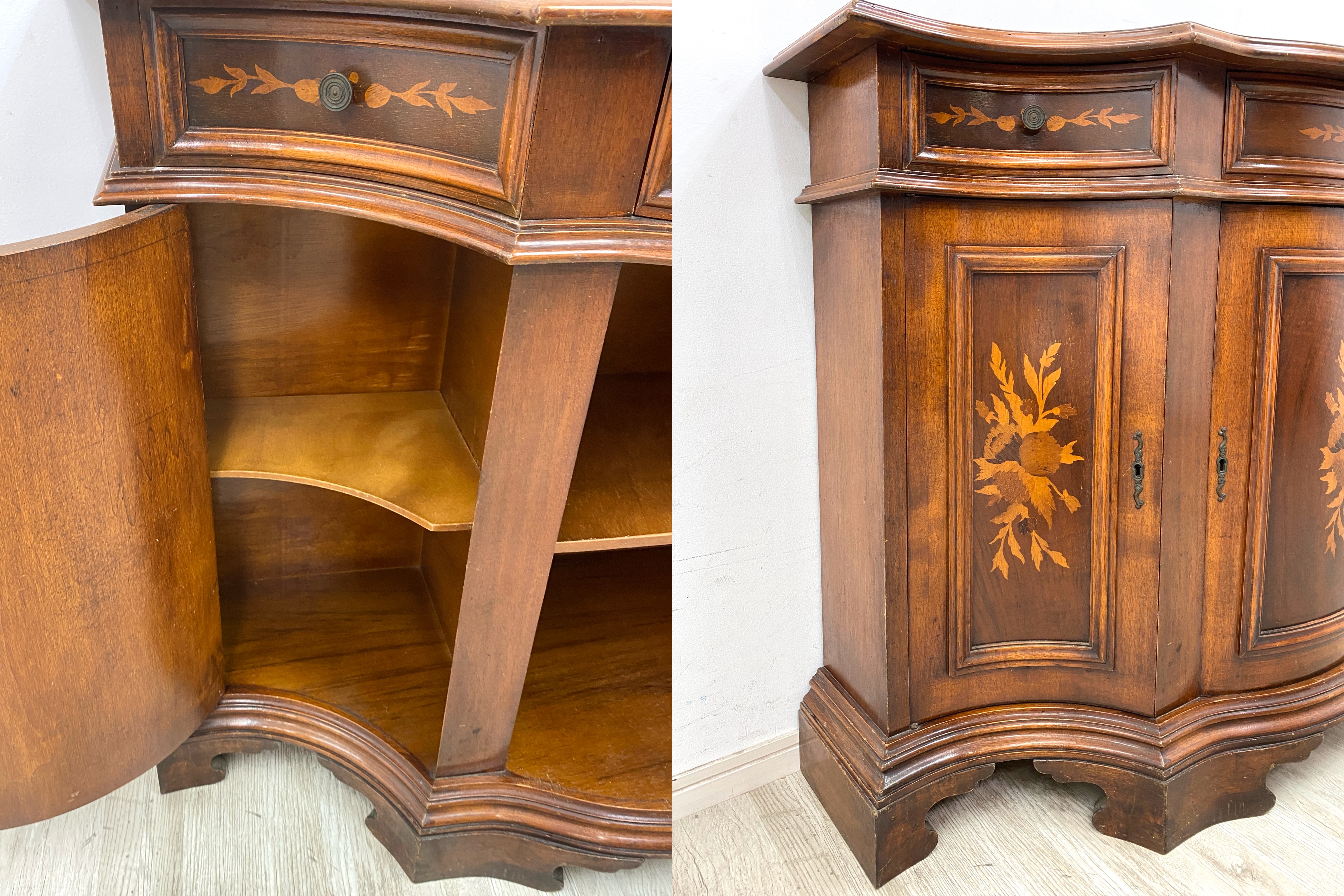 こちらはイタリア製 アンティークサイドボードです。 中古品です。 アンティークのイタリア製サイドボードのご紹介です。こちらは美しい象嵌細工を施した職人技の光る逸品。 世界中で高い評価を受け続けているイタリア象嵌は、緻密な技術とデザイン性が最大の魅力です。 天然木を使用し、手作業で模様を作り上げていくため、色の濃淡や配置など同じ仕上がりのものはありません。 全体のシルエットも美しく、細部にわたり丁寧に仕上げられた高級家具といえます。 小さめの引出しが3箇所、両サイドと中央に鍵付きの収納を備えた便利な一台。 鍵付きでなので、大切な物をしまっておく収納棚としてもおすすめです。 棚板は固定されていませんが、隙間無く収まっているため取り外し困難です。 お部屋に一つイタリア家具を置くだけで、華やかで気品漂う空間を演出していただけます。 アンティーク家具ならではの、使いこまれた風合いが心地良い家具となっています。 【コンディションについて】 年月を経た古いもののため、全体にキズや塗装剥がれ、変色などあります。 引出しは経年による歪みのためか、引き出す際に少し引っかかりを感じますが、日常で使う分には支障のない程度です。 このほか、古い家具特有の匂いが少しあります。使い込まれた風合いや職人の手仕事による繊細な装飾など、 長い年月を経ても色褪せない美しさを感じる唯一無二のお品です。 他詳細については下記画像も併せてご参照ください。