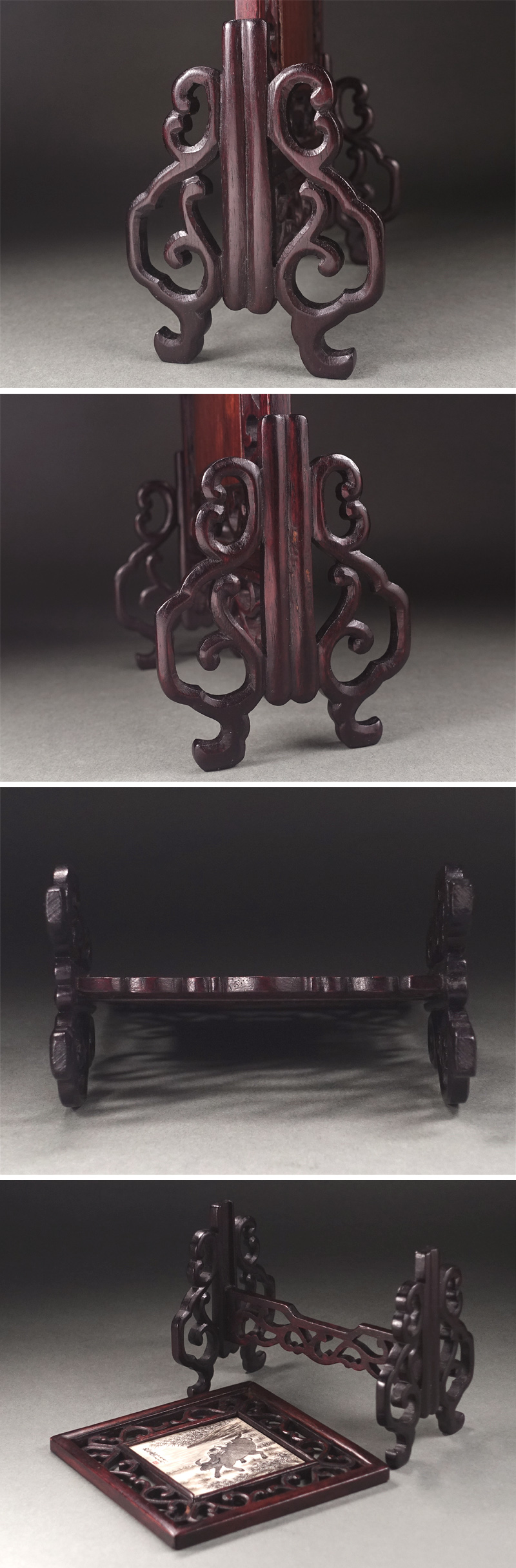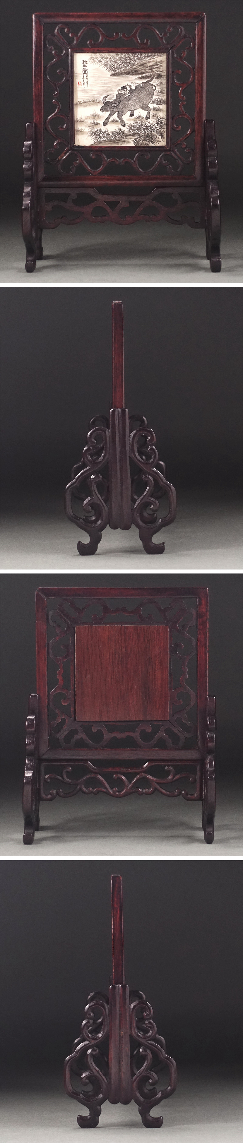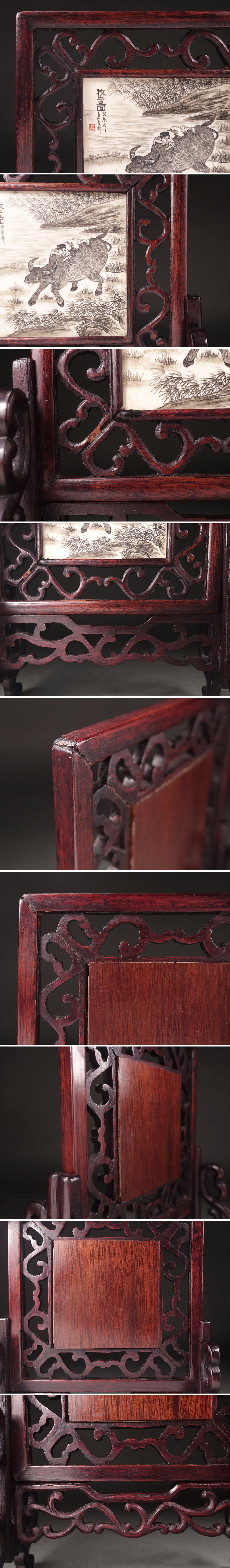 ∇花∇中国文房古玩 紅木製牙嵌牧牛彫硯屏 戊辰年夏月刻 吉印あり 中国美術 唐物書道具 收藏
