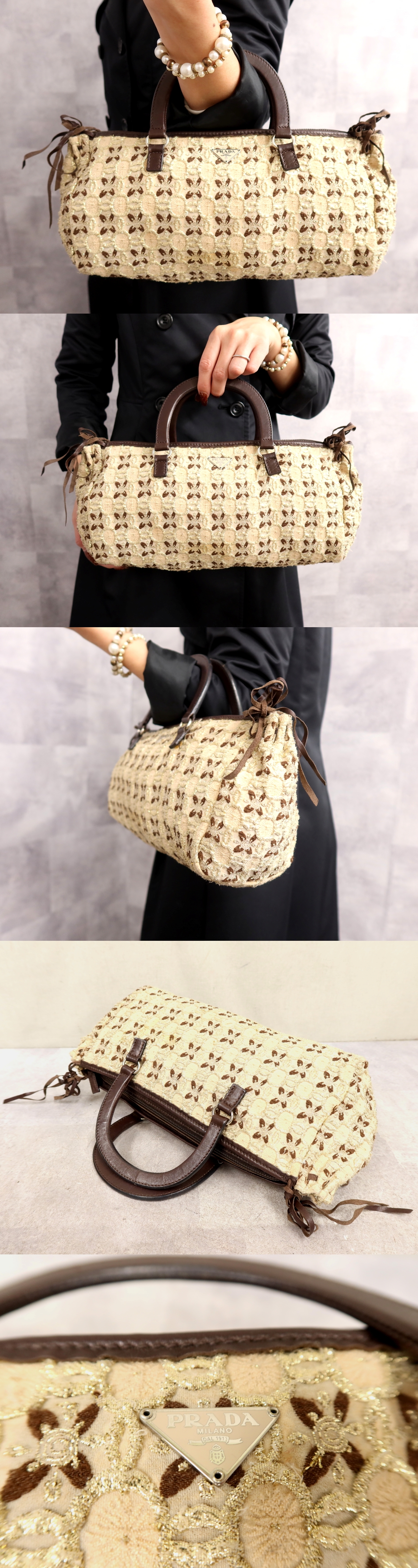 ●美品●PRADA プラダ●花刺繍●キャンバス カーフ レザー 本革●ハンド バッグ●ベージュ ダークブラウン●SV金具●イタリア製●Js64102 收藏