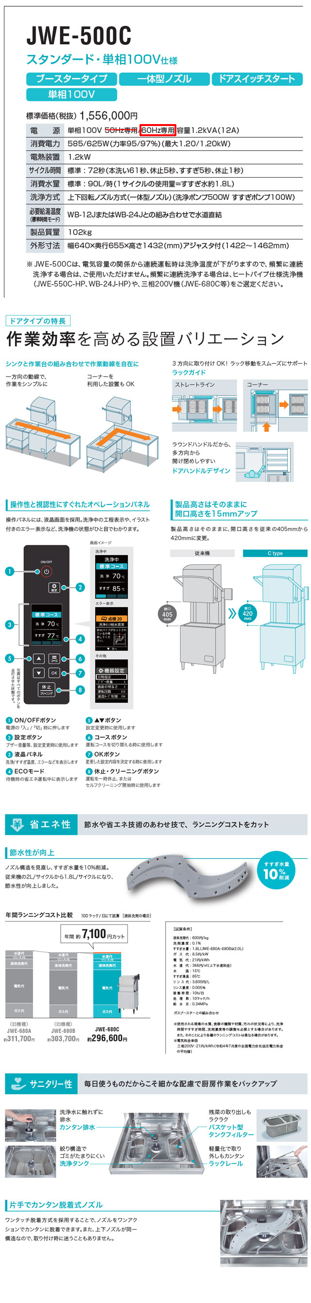 ホシザキ ドアタイプ食器洗浄機 JWE-500C(60HZ) を出品いたします。 ■特徴■ 洗浄力と省エネを両立しながら、 使いやすさも追求。 操作性と視認性にすぐれたオペレーションパネル 操作パネルには、液晶画面を採用。 洗浄中の工程表示や、 イラスト付きのエラー表示など、 洗浄機の状態がひと目でわかります。 製品高さはそのままに 開口高さを15mmアップ 製品高さはそのままに、 開口高さを従来の405mmから 420mmに変更。 節水性が向上 ノズル構造を見直し、すすぎ水量を10%削減。 従来機の2L/サイクルから1.8L/サイクルになり、 節水性が向上しました。 片手でカンタン脱着式ノズル ワンタッチ脱着方式を採用することで、 ノズルをワンアクションでカンタンに脱着できます。 また、上下ノズルが同一構造なので、 取り付け時に迷うこともありません。 ラックガイド 方向に取り付けOK! ラック移動をスムーズにサポート ラウンドハンドル 多方向から開け閉めしやすい ドアハンドルデザイン ■仕様■