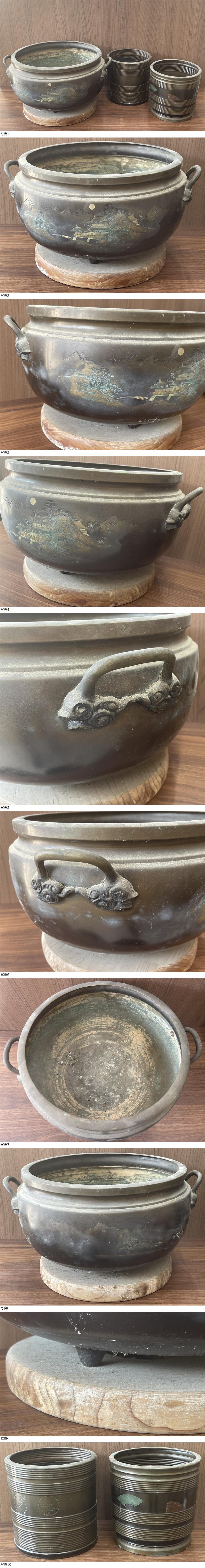 | (T055) 火鉢 3点まとめ 木製台座 双耳 三足火鉢 材質不明 古道具 アンティーク 時代物 金属工芸 昭和レトロ 現状品 詳細不明 |