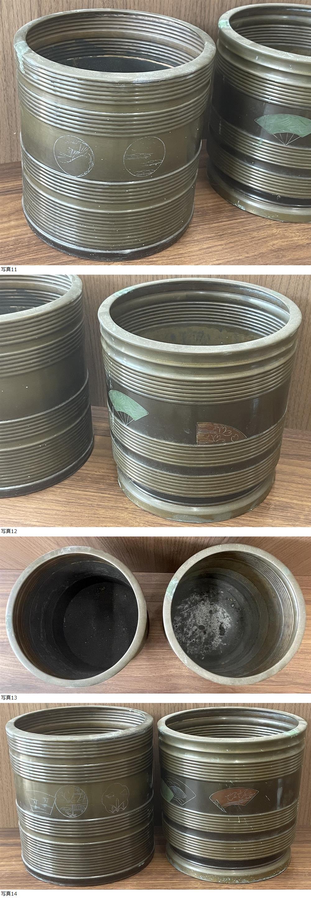 (T055) 火鉢 3点まとめ 木製台座 双耳 三足火鉢 材質不明 古道具 アンティーク 時代物 金属工芸 昭和レトロ 現状品 詳細不明 收藏