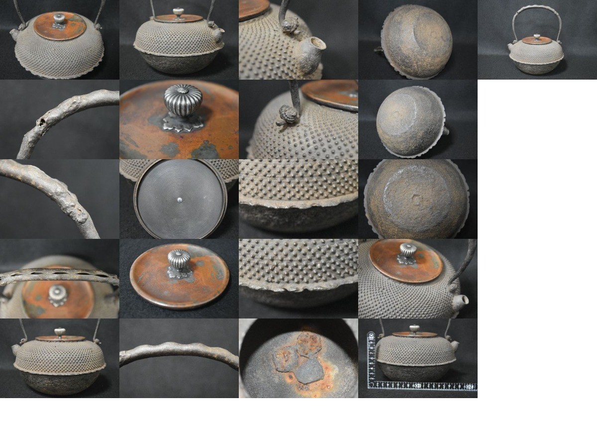【光成】紫金堂・忠三郎造「枝豆堤手・銀大摘・紫斑銅蓋・姥口・時代鉄瓶」水漏無