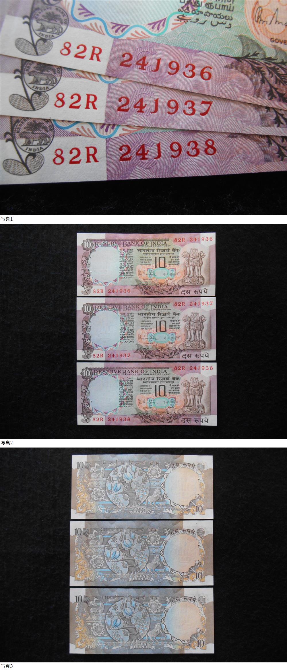 | 旧紙幣 インド 10ルピー 連番3枚 美品~極美品級 B-0043 |