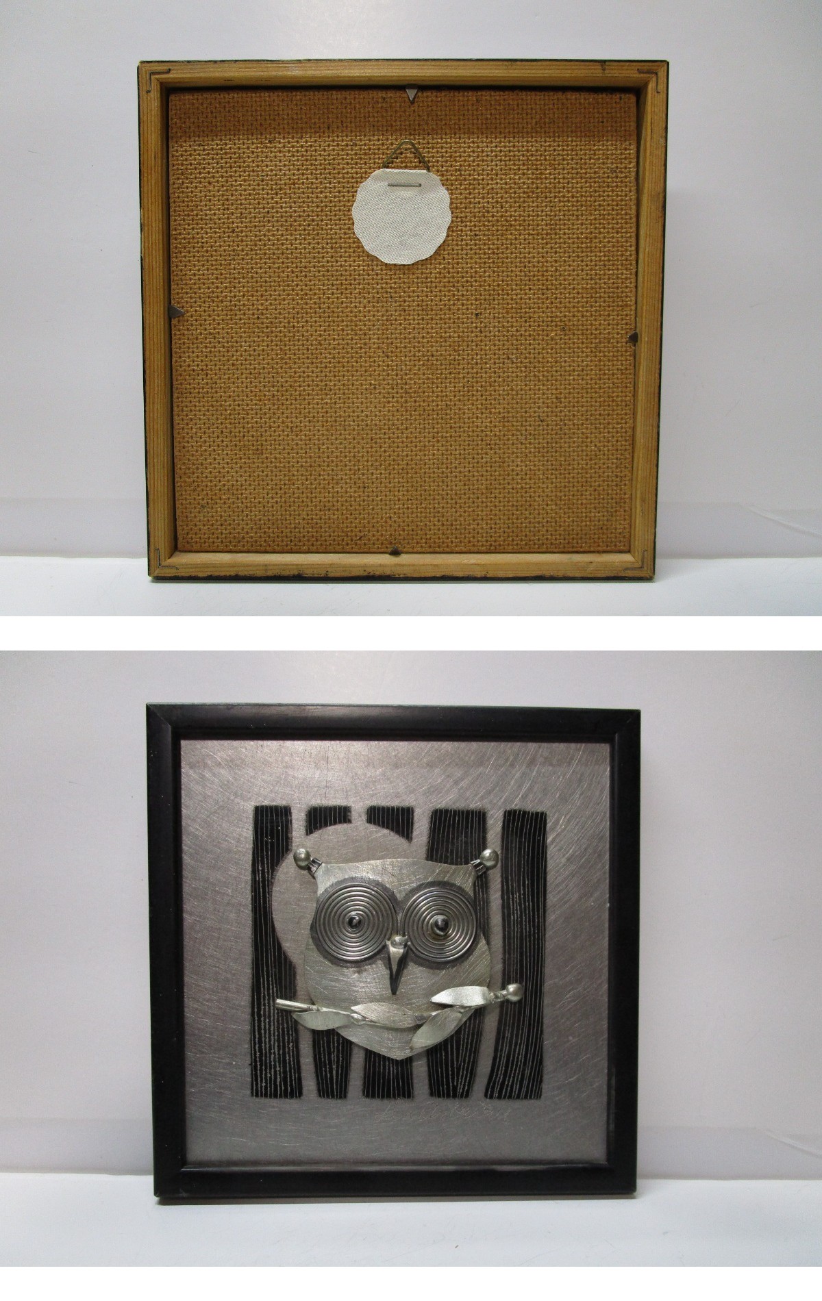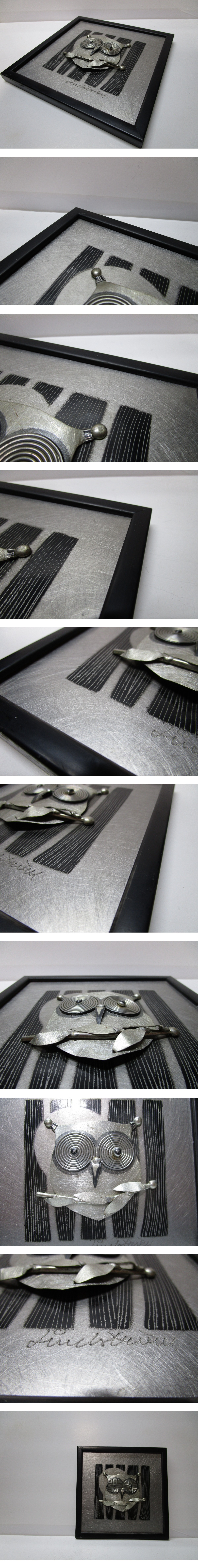 コルク板に貼り合わせたアルミ板に細かく刻んだ鋤き模様、その上に貼り合わせた細かなアルミパーツで表現されたかなりデフォルメをくわえられたフクロウがミッドセンチュリー期の北欧デザインらしいモダンな中に親しみやすい表情をのぞかせています。重層的な構成なので、作品に奥行きが感じられます。同時期に活躍した同じ北欧スウェーデンのS.リンドベリやリサラーソンの陶板作品に通じるほどよいコミカライズをくわえられた造形がユニークな1品です。