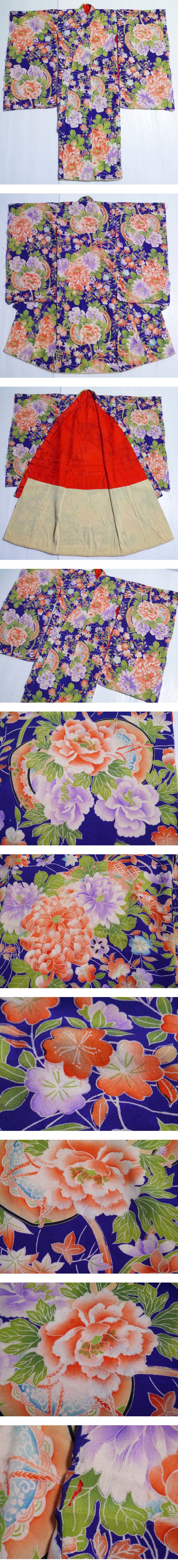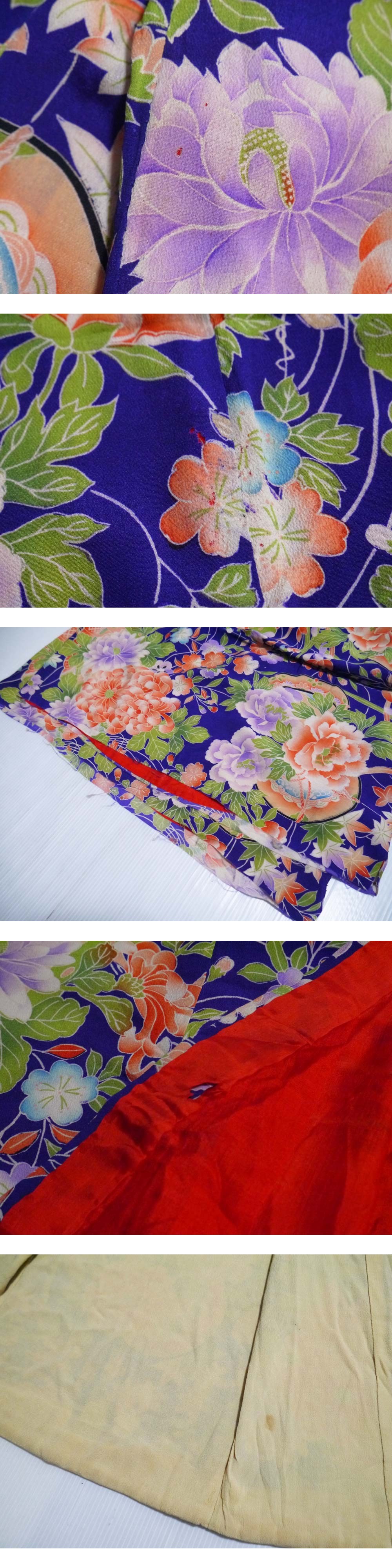 【KIRUKIRU】アンティーク 子供着物 一つ身 正絹 錦紗 大正ロマン 青紫地 四季の花 鼓 扇 レトロ 古布 古裂 リメイク 材料 生地 人形細工 收藏