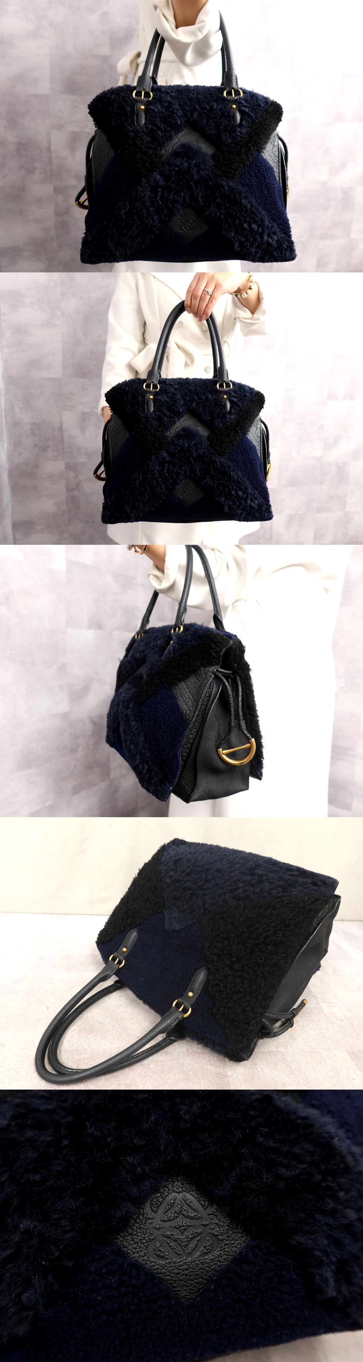 ●超美品●LOEWE ロエベ●アナグラム●ロゴ型押し●ムートン カーフ レザー 本革●ハンド バッグ●ダークネイビー●G金具●B5●Js64612 收藏
