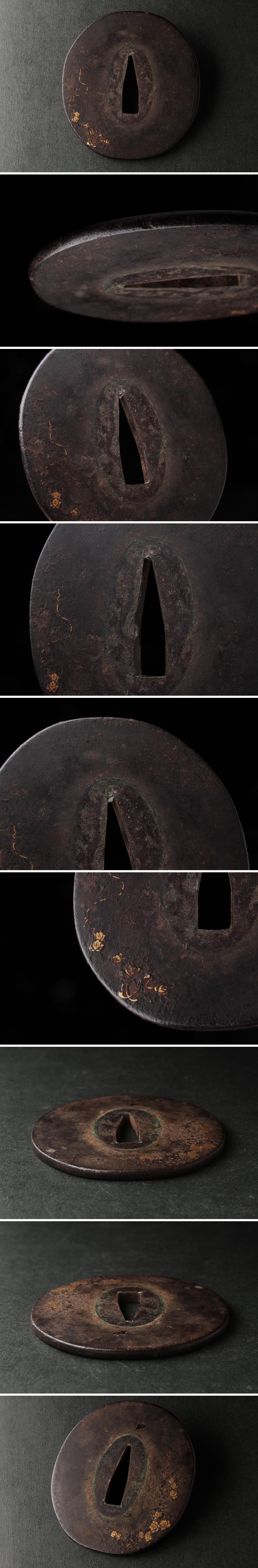 | ◆ 時代刀装具 無銘 鉄磨地 金象嵌 蔦蔓図 竪丸形鍔 縦7.5cm・鉄象嵌鍔・鉄鐔・古鍔 武具 古金工 古美術 小道具 ◆