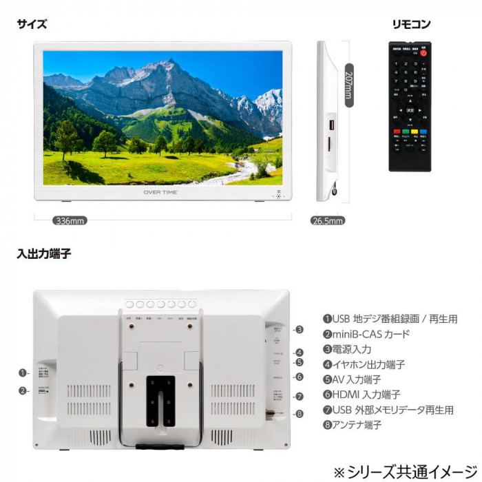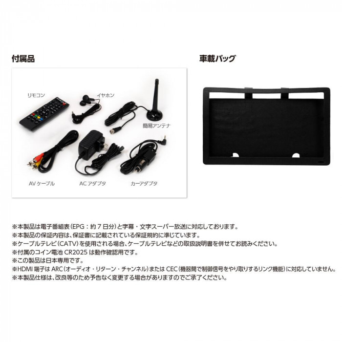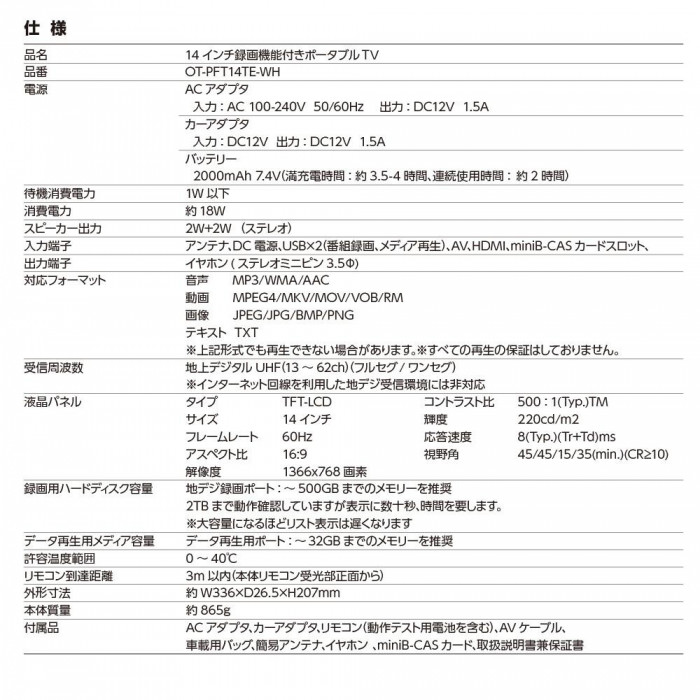 | ドライブや屋外でも使える3電源対応のポータブルTVです。画素数1366×768の液晶パネル搭載。細部まで精彩かつ鮮明な映像をお楽しみいただけます。地デジの番組を録画再生できるUSBメモリやハードディスクを接続してテレビ番組の録画ができます。また、動画、音声、画像ファイルの再生もできます。ドライブや屋外でも使える3電源対応で、ドライブ中も動画が楽しめる車載キットを付属。 壁掛けができるフックスタイル、自立スタンド付きなのでどこでも使えるアイテムです。 ※本製品は電子番組表(EPG:約7日分)と字幕?文字スーパー放送に対応しております。 ※本製品の保証内容は、保証書に記載されている保証規約に準じています。 ※ケーブルテレビ(CATV)を使用される場合、ケーブルテレビなどの取扱説明書を併せてお読みください。 ※付属のコイン電池 CR2025は動作確認用です。 ※この製品は日本専用です。 ※HDMI端子は ARC(オーディオ?リターン?チャンネル)または CEC(機器間で制御信号をやり取りするリンク機能)に対応していません。 ※本製品仕様は、改良等のため予告なく変更する場合がありますのでご承了ください。 ※上記形式でも再生できない場合があります。 ※インターネット回線を利用した地デジ受信環境には非対応です。 ※すべての再生の保証はしてをりません。 ※大容量になるほどリスト表示は遅くなります。(データ再生用ポート?32GBまでのメモリーを推奨) ※2TBまで動作確認していますが表示に数十秒、時間を要します。 ※本製品はPSマークの対象外の製品です。 ※USBメモリとハードディスクは別売です。 受信周波数:地上デジタルUHF(13?62ch)(フルセグ/ワンセグ) 液晶パネル:タイプTFT-LCD サイズ :14インチ フレームレート:60Hz アスペクト比:16:9 解像度:1366×768画素 コントラスト比:500:1(Typ.)TM 輝度:220cd/平方メートル 応答速度:8(Typ.)(Tr+Td)ms 視野角:45/45/15/35(min.)(CR≧10) 録画用ハードディスク容量:(地デジ録画用ポート?500GBまでのメモリーを推奨) 許容温度範囲:0?40度 リモコン到達距離:3m以内(本体リモコン受光部正面から) |