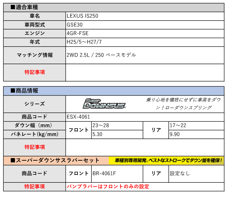 [エスペリア]GSE30 レクサスIS250_250 ベースモデル(H25/5~H27/7)用スーパーダウンサス&バンプラバー[車検対応] 收藏