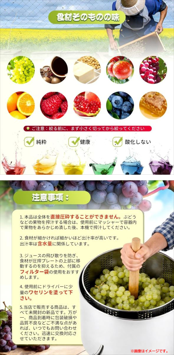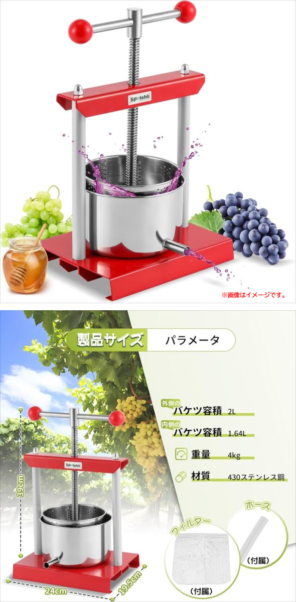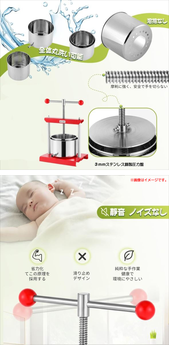 【商品特長】 ◆3つのメリット 1. 静音:マニュアルで操作することで、ノイズが発生しません。 2. 省力化:てこの原理を採用しますので、一人でも大量な食材を搾られます。 3. 健康:手作業で栄養を損なわなく、環境にもやさしいです。 ◆430ステンレス鋼製で全体を丸洗い可能です。溶接をしていないので、金属汚染はありません。 ◆2/3/5L、三つの容積が選択できます。業務用だけでなく、自宅で新鮮な蜂蜜あるいはジュースを搾りたい時にも活躍。 ◆蜂蜜圧搾機として広く使用されていますが、果物あるいは豆腐など柔らかい食材にもオススメです。 【ご注意】 本品は食材全体を直接圧砕することができません。ぶどうなどの果物を搾汁する場合は、 使用前にマッシャーで容器内で果物をあらかじめ潰した後、本機で搾汁してください。 | |||||||||||