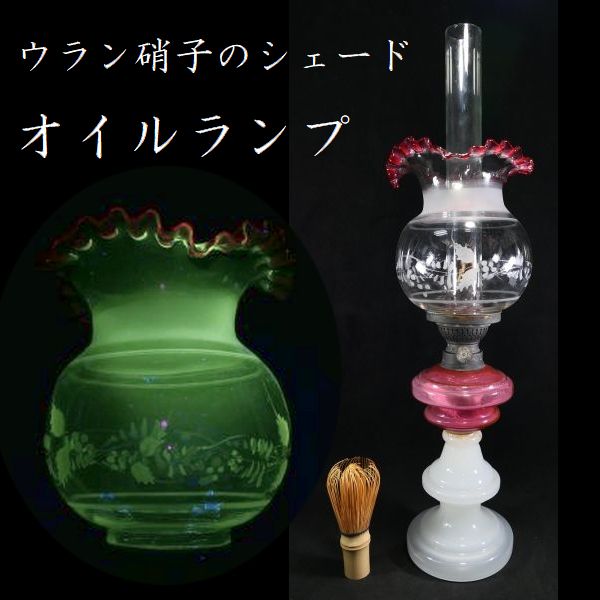 【 恵 #2085 】 ウラン硝子のシェード付 アンティーク 乳白 唐草文様 フリル形シェード オイルランプ 検:鉢/古ガラス/氷コップ/色ガラス/ 收藏
