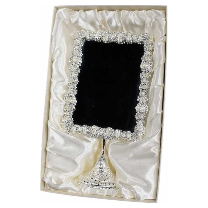 | パールとクリスタルのデコレーションがかわいいスタンドミラーです。上下にも、左右にも、角度が変えられます。合金製でしっかりとした重さがあり、ギフトにもお勧めです。 |
