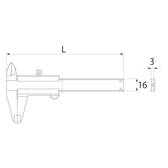 | 読み取りやすいロングバーニヤ採用です。駆動部へのゴミの侵入を防ぐ目盛面段付きです。本尺部は幅16mm、厚み3mmです。 |