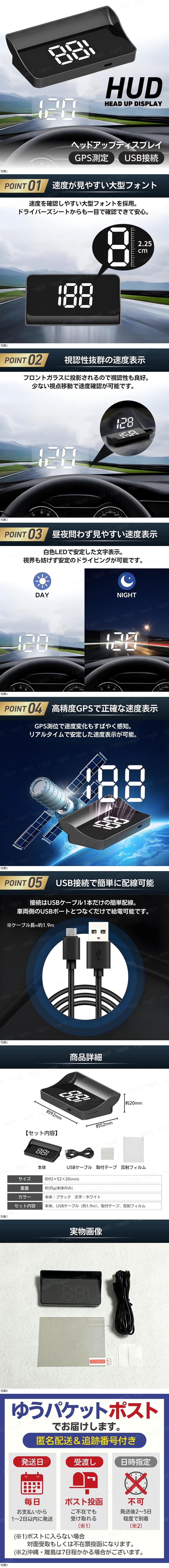 ヘッドアップディスプレイ HUD GPS搭載 スピードメーター デジタル USB電源 LED 汎用 投影式 自動車 トラック 軽 ケーブル 速度 追加 付属 收藏