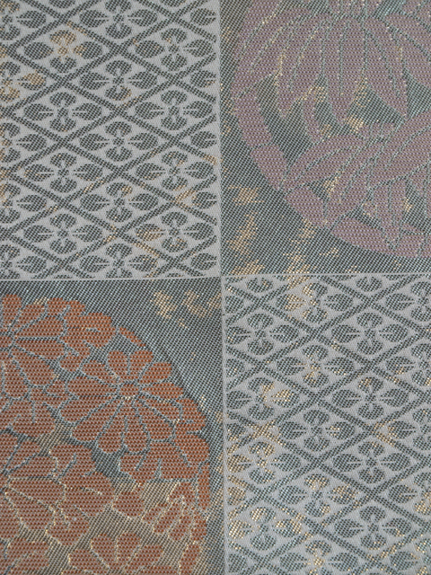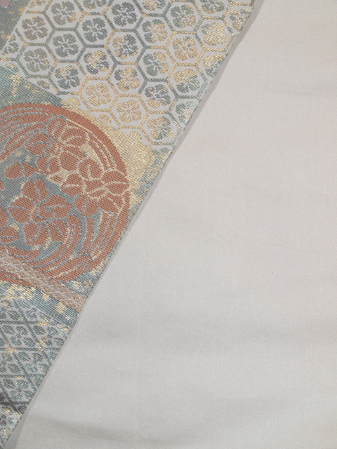 全体的な印象としては水浅葱(みずあさぎ)色の地に、花襷(たすき)と花亀甲の地紋と松竹梅や菊、水仙などの花丸の文様が配された市松格子縞の文様が織り込まれている引箔の西陣織の袋帯です。京都・西陣の老舗の織屋「服部織物」さんで企画・製作されたお品でたれ裏の折り返し内側にロゴマークと「こはく錦」の銘が織り込まれています。 200 年以上続く服部織物さんの特長でもあるこはく錦の帯は、重厚な見た目とは異なり、軽く締めやすいのが人気の被密です。通常の袋帯よりも 1000 本以上多い経糸で織りあげながらも、一般のものよりも細く、しかも切れにくい上質の織糸と、織り込むためには両面箔糸よりも繊細さと技術が要求される片面箔糸を用いているために軽い帯になっているのです。渋め基調のなかでパステル調の花丸がかわいらしく映え、やさしく気品の感じられるお色目が素敵ですね。 ユーズド品で、ごくうっすらとした前の折り跡と結びジワがありますが、あまり使用感は感じられません。裏面に長さ約 1cm の織りキズが 一か所ありますが、気になるようなものではありません。そのほかにしみやよごれ、褪色などのダメージは見あたらず、とてもきれいな状態です。 |