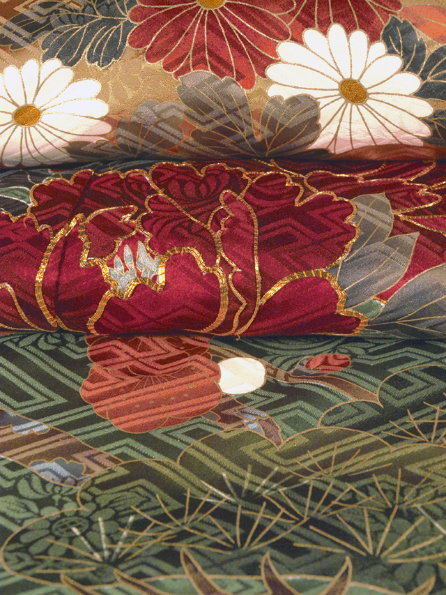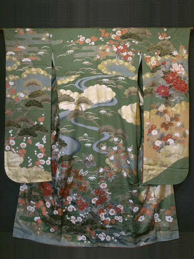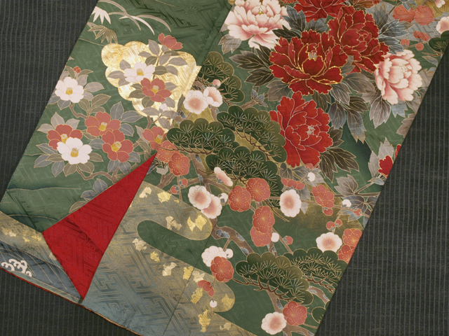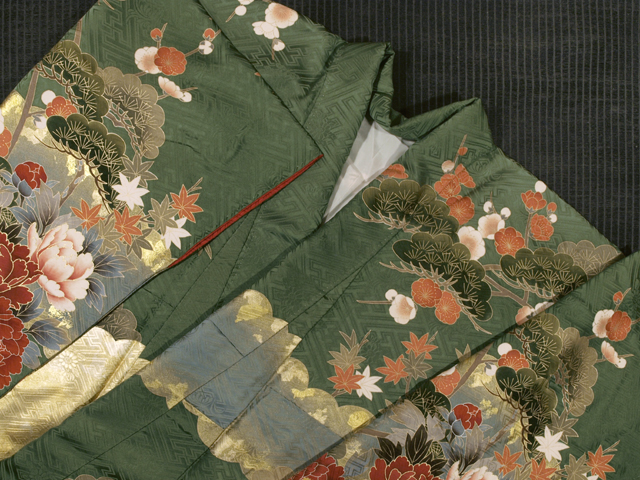 濃いめの沈んだ老竹(おいたけ)色の地に紗綾形(さやがた)の地紋が織り出され、雲と霞(かすみ)、松、梅、竹、笹、桐、菊、牡丹、桜、橘などの草花、露芝、流水などの文様が友禅染めされている綸子の振袖です。袷仕立てです。 品の良いお色目で、深みのある和の趣きに意匠の高い完成度が感じられます。とても格調が高く、格好良さがあります。文様の周囲の細い輪郭部分の糸目には金彩が施されているほか、雲の文様には刷箔がふんだんに施されています。また、画像のとおり、色違いの地色(弁柄色)の共八掛が配されている豪奢なお仕立てです。 ユーズド品と思われますが、使用感は感じられません。しみやよごれ、褪色などのダメージも見あたらず、新品同様にきれいです。※着用サイズの適合する長襦袢を出品している場合があります。 |