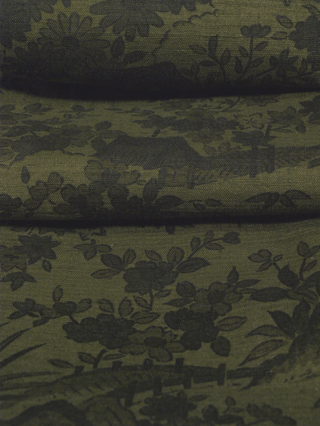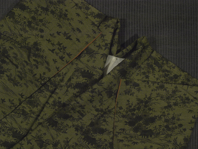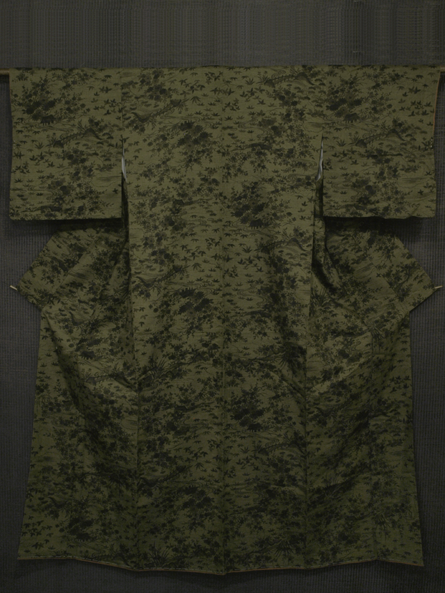 深く沈んだ松葉色の地に、茶屋辻の文様が染められた真綿紬です。袷仕立てです。 深みのあるさわやかなお色目で、素朴なタッチの意匠に癒されます。ほっこりとした手ざわりの紬らしい紬地です。 しつけ付きの仕立て上がり未使用保管品です。しみやよごれ、褪色などのダメージは見あたらず、新品同様です。 |